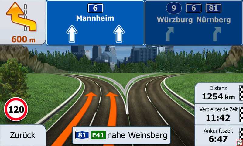 Alle Systeme verfügen über sog. Sign Posts, also eine Anzeige der Ortsschilder (Autobahnen und teilw. Bundesstr.). Die Umsetzung ist allerdings sehr unterschiedlich. Am besten sind die Schilder bei MEDION, NavGear und TomTom umgesetzt und sehen dem Original im Straßenverkehr sehr ähnlich. Bei Garmin werden die Schilder im Splitscreen angezeigt und sind dadurch teilweise derart klein, dass während der Fahrt ein Ablesen unmöglich ist. Das ist umso unverständlicher, weil es sogar MEDION mit einem 3,5 Zoll Display schafft, die Schilder klar lesbar abzubilden. Bei Arival wird nur der Text des Schildes angezeigt, keine echte Schilderansicht, dadurch wird der Vergleich zwischen Navianzeige und Umwelt erschwert.