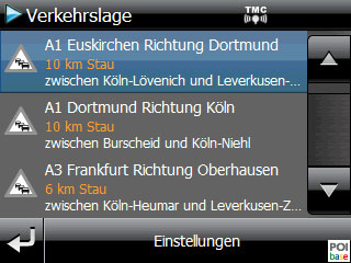 Unter dynamischer Zielführung verstehen wir die Beeinflussung der Route durch aktuelle Verkehrsmeldungen. Bis auf Mio verfügen alle Navis über einen TMC-Empfänger und ermöglichen eine automatische Stauumfahrung. Besonders in der Zahl an Einstellungen und in der Visualisierung unterscheiden sich die Navis. Während z.B. TomTom eine tolle Visualisierung des Staus auf der Karte und entlang der Route bietet, sind bei Garmin und Arival keine Einstellungen und nur eine rudimentäre und teilweise unverständliche Anzeige möglich. Die meisten Optionen bietet wieder mal die NavGear-Software, hier kann wirklich alles nach Wunsch eingestellt werden und auch die Übersicht der Meldungen ist gut gelungen.