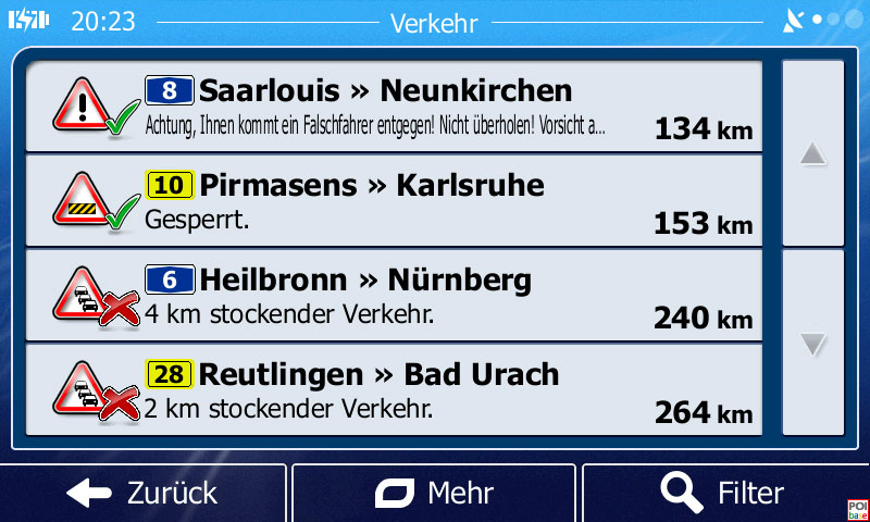 | Dynamische Zielführung | wenig Einstellungen Gesamtliste schlechte Anzeige auf der Karte ![]() | keine Einstellungen Gesamtliste unklares Verkehrsmenü TMCpro optional ![]() | wenig Einstellungen Gesamtliste sehr gute Anzeige auf der Karte ![]() | nur optional![]() | sehr viele Einstellungen Gesamtliste gute Anzeige TMCpro optional ![]() | wenig Einstellungen keine Gesamtliste bestmögliche Anzeige auf der Karte ![]() |