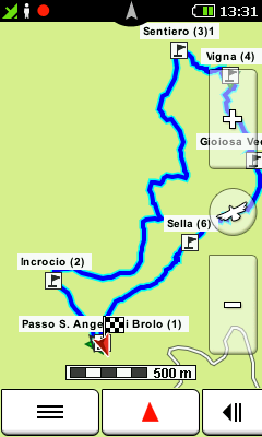 Das automatische Zoomen wurde verändert. Bei gleichen Geschwindigkeiten zeigt der Lux 32 nun ein etwas größeres Gebiet an als der Lux 30. Aus unserer Sicht positiv, weil damit der weitere Verlauf der Strecke noch etwas deutlicher wird. Bei der Einstellung „automatischer Zoom“ erscheint bei langsamer Fahrt bzw. Anhalten der gewählte Track sehr deutlich – die schmale blaue Linie wird zu einer fetten blauen Linie.