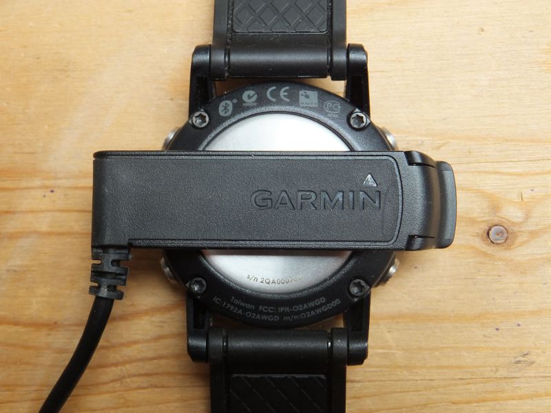 Der USB-Anschluss erfolgt nicht über eine der bekannten Buchsen, sondern mittels eines Bügeladapters auf der Gehäuserückseite. Das erhöht wahrscheinlich die Unempfindlichkeit gegen Wasser. Hat man aber die proprietäre USB-Verbindung der Fenix mal nicht zur Hand, helfen USB-Kabel anderer Geräte nicht weiter. Nutzer berichteten in Reaktion auf diesen Test, dass manchmal der Bügel nicht richtig an der Uhr anliege und es zu keiner Verbindung komme. Darum in dieser Stelle der Hinweis, dass der Adapter mit einem hörbaren Klacken einrasten muss. Bleibt das Geräusch aus, sind Uhr und Bügel eventuell miteinander verbunden, es erfolgt aber kein Daten- bzw. Stromfluss.
