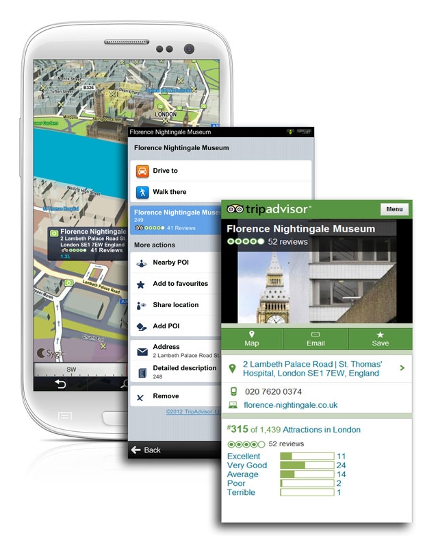 Wie externe Diensteanbieter Sygic Places nutzen können, um ihre Sehenswürdigkeiten, Orte von Interesse oder Informationen an viele Nutzer zu verbreiten, soll TripAdvisor demonstrieren. Die POIs von TripAdvisor beinhalten Bewertungen, Kommentare und Reiseinformationen zu verschiedenen Standorten in mehr als 25 Städten und können in der App über den Menüpunkt My Sygic aufgerufen werden.
