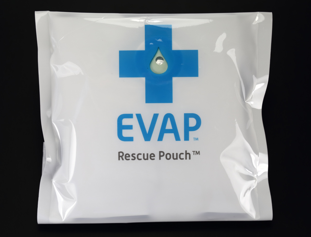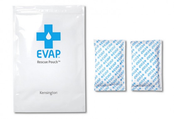 Das Kensington EVAP Rescue Pouch ist eine luftdicht verschließbare Tüte mit zwei hygroskopischen (wasserziehend) Beuteln und einem Feuchtigkeitssensor. Das nasse Gerät wird zunächst oberflächlich getrocknet und wenn möglich der Akku entnommen. Anschließend legt man das feuchte Gerät zwischen die beiden hygroskopischen Beutel und verschließt das EVAP luftdicht. Die chemische Reaktion startet und entzieht dem Gerät die Feuchtigkeit und bindet diese sicher in den hygroskopischen Beuteln. Die Feuchtigkeitsanzeige im EVAP soll den Prozess transparent machen und sicherstellen, dass man den Beutel nicht zu früh öffnet. Laut Hersteller soll das Trocknungsmittel 700% effektiver sein als Reis.