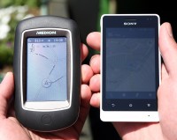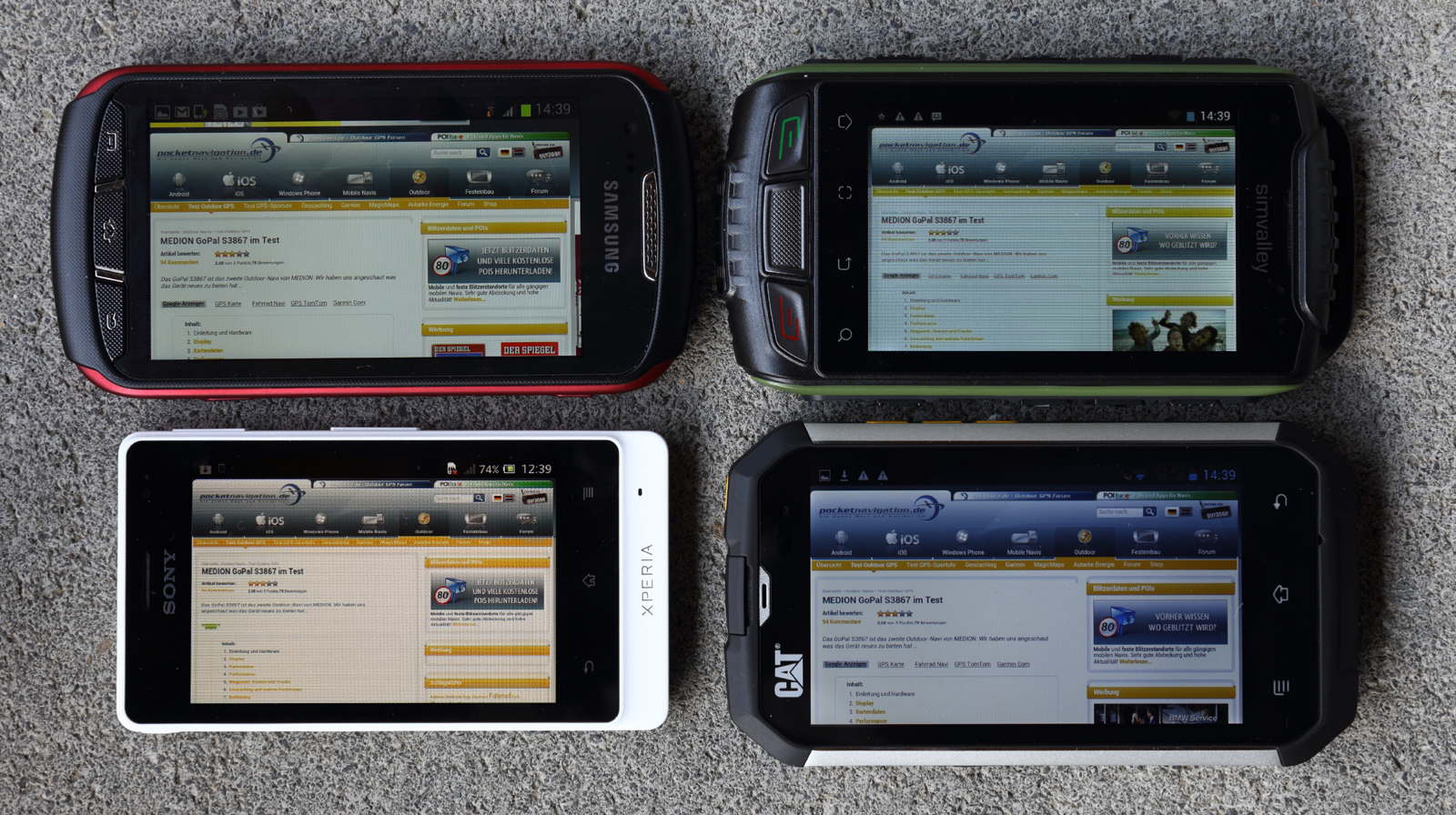 Die größte Herrausforderung für ein outdoortaugliches Display ist direktes Sonnenlicht. Leider versuchen alle vier Hersteller hauptsächlich, der Sonne die Kraft der Hintergrundbeleuchtung entgegenzusetzen, statt das Sonnenlicht hinter dem Display zu reflektieren. Somit verwundert es nicht, dass alle vier Displays im direkten Sonnenlicht nur schwer abzulesen sind. Dank der etwas helleren Hintergrundbeleuchtung ist das Sony XPERIA go noch am ehesten abzulesen. Vor allem das Display des Simvalley SPT-800 v2 neigt sehr stark dazu, zu verschmieren. Diese Verschmutzungen entstehen durch normale Benutzung und lassen sich nur schwer beseitigen und führen im direkten Sonnenlicht zu störenden Reflexionen. Warum gerade das Display des SPT-800 besonders betroffen ist, ist uns unklar.