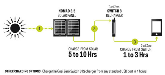 Das Zero Goal Switch 8 Solar Kit besteht aus einem leichten Akkulader, einem faltbaren Nomad 3.5 Solarpanel und einem USB-Verbindungskabel. Der Switch 8 ist ein externer Akku auf Basis einer Li-Ion-Akkuzelle (18650), der über eine stabilisierte 5-Volt-Spannung geladen und entladen wird. Das Switch 8 verfügt auf beiden Seiten über abschraubbare Enden, die jeweils USB-Eingang oder USB-Ausgang zur Verfügung stellen. Die Idee hinter den abschraubbaren Enden: in Zukunft soll es Funktionsmodule zum Aufschrauben geben, z.B. eine Taschenlampe. Diese Module sind laut Goal Zero in Planung. Einen Termin gibt es noch nicht.
