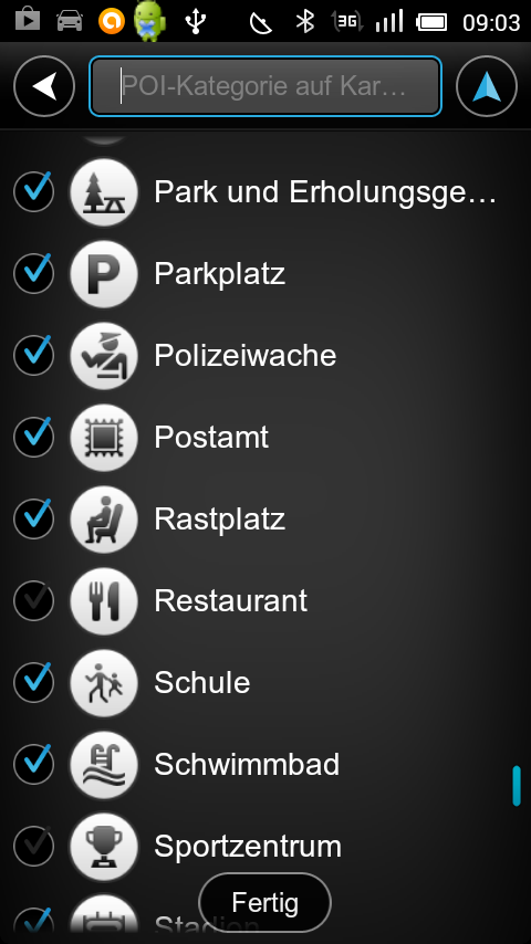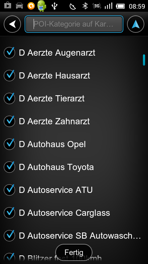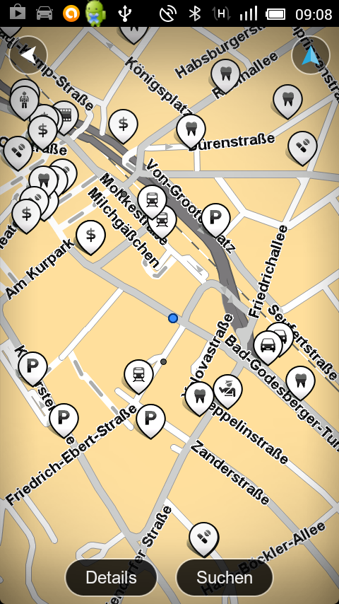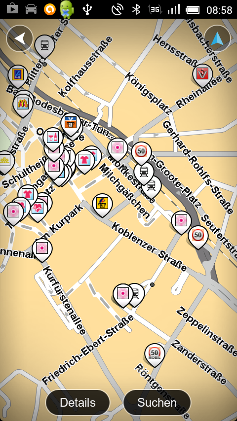Wie in jedem anderen Navigationsprogramm, sind auch hier viele Sonderziele implementiert. So muss man deren Anzeige auf der Karte besonders in Großstädten beschränken, damit man z.B. bei einer Übersichtskarte überhaupt noch Straßen erkennen kann. Aber da die Sonderziele in Kategorien aufgeteilt sind, kann man die für sich interessanten jederzeit auswählen.