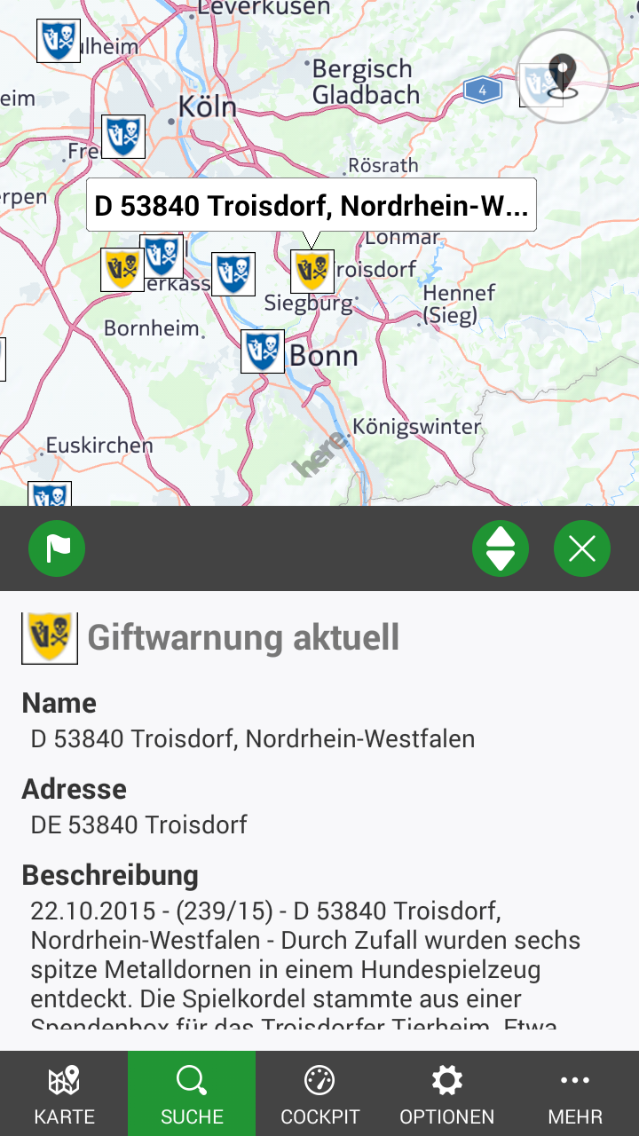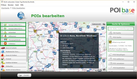 In Zusammenarbeit mit giftwarnung.info und zur Unterstützung dieses privaten Projekts bieten wir die Standorte der Meldungen als POI-Kategorie über die kostenlose Software POIbase zum Download an.