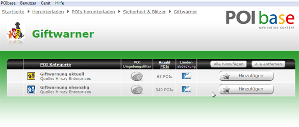 Die GiftKöderRadar POI-Kategorien befinden sich in POIbase in der Kategorie: Herunterladen POIs herunterladen