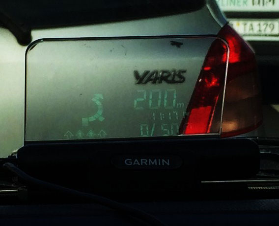 Das Garmin-Head-Up-Display hat mich unglaublich stark an diese „Pionierzeit“ erinnert – wieder sind es „einfache“, monochrome Pfeildarstellungen. Anders ist, dass diese direkt in meinem Blickfeld erscheinen und ich meinem Blick nicht mehr von der Straße abwenden muss.