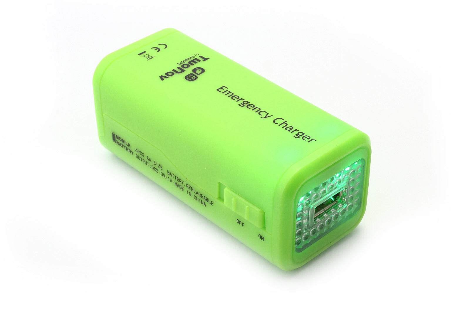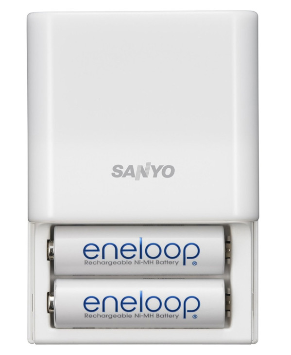 Der Sanyo KBC-E1S-E nimmt zwei AA-Akkus auf, welche über den USB-Eingang auch geladen werden können. Leistung und Kapazität sind sehr begrenzt. Das Gerät verwendet eine Art Pulsladeverfahren und kann somit auch größere Geräte zumindest um einige Prozent aufladen (getestet mit iPad 1). Insgesamt ist aber der Wirkungsgrad geringer als bei anderen AA-Akkuladern und die erreichbare Kapazität ist auch mit hochwertigen AA-Akkus zu gering.