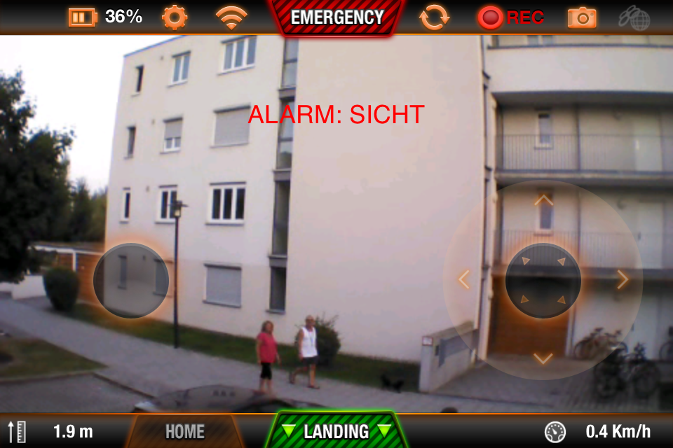 Diese Art die Drohne zu fliegen ist für Anfänger deutlich sicherer, da die AR.Drone in einer Art „Halbautomatik“ und damit keine zu gewagten Flugmanöver fliegt – wie es bei ungeübten Piloten im Eifer des Gefechts durchaus mal passieren kann.