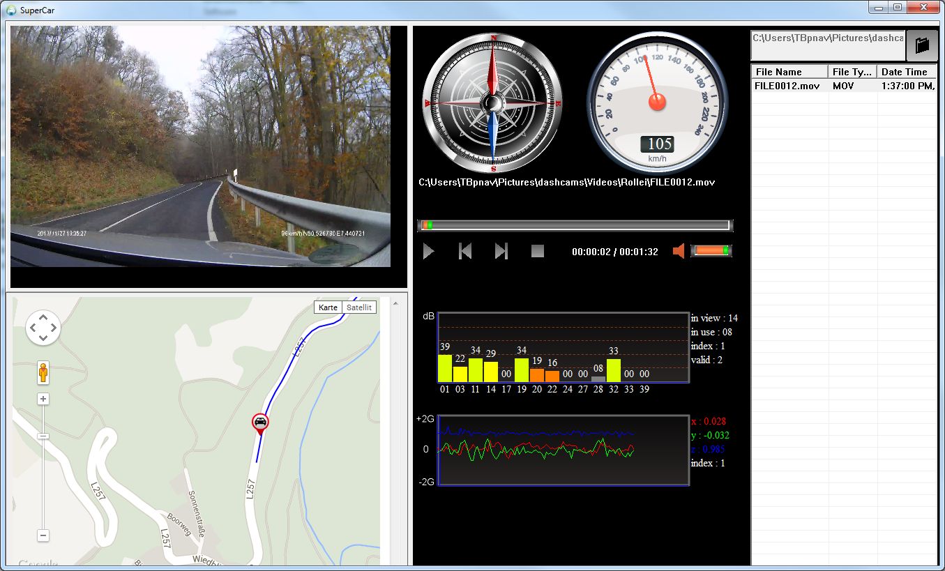 Rollei legt der DVR 110 die Software SuperCar bei. Installation und Auswertung waren im Test problemlos. Die GPS- und G-Sensordaten werden im Videoformat gespeichert und können über die Software SuperCar angezeigt werden.