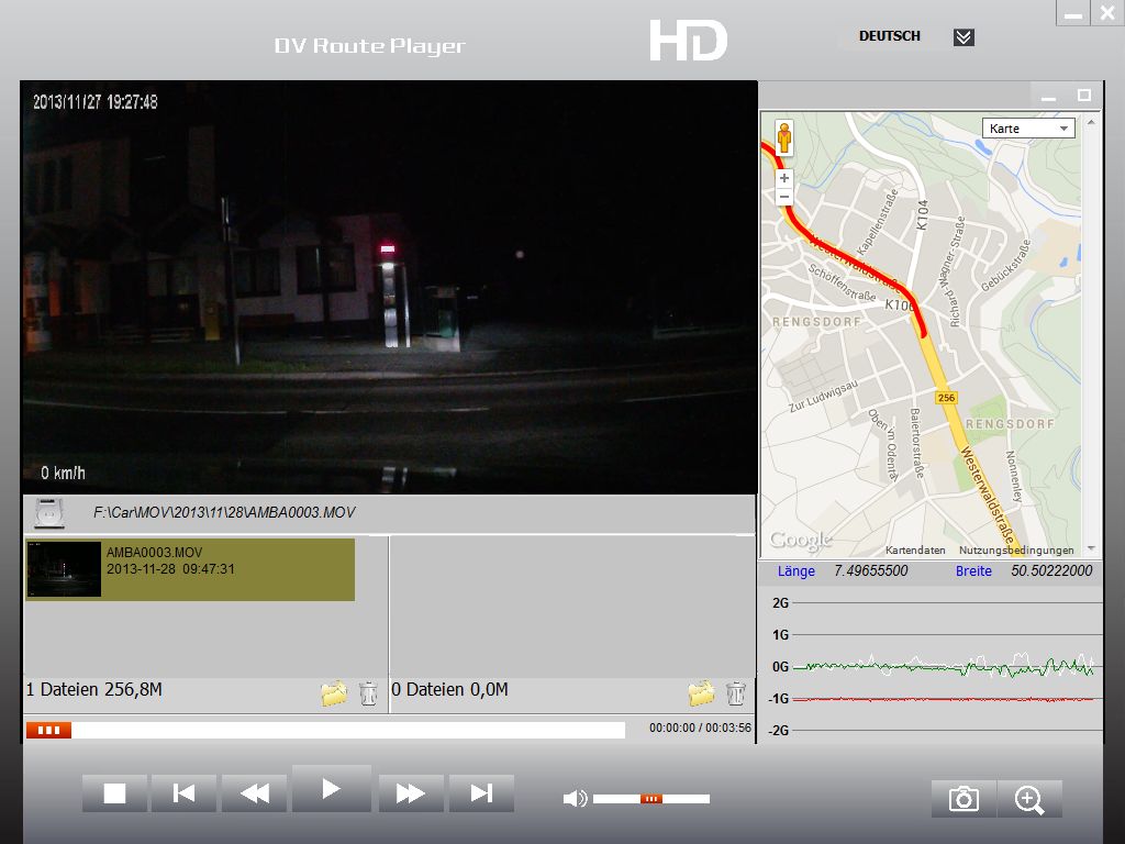 Somikon legt der MDV-2290 die Auswertungssoftware DV ROUTE PLAYER bei. Die Software ist kompliziert zu installieren und startet in russischer Sprache. Auch im Betrieb gab es mit der Software erhebliche Probleme. So lässt sich die Software nicht auf einem PC mit zwei Bildschirmen betreiben, das Fenster kann in diesem Fall nicht verschoben werden und liegt quasi zwischen den Bildschirmen. Auf unserem Test-PC lief die Software instabil und stürzte häufig ab. Zum Abspielen muss ein zusätzlicher Video-Codec installiert werden.