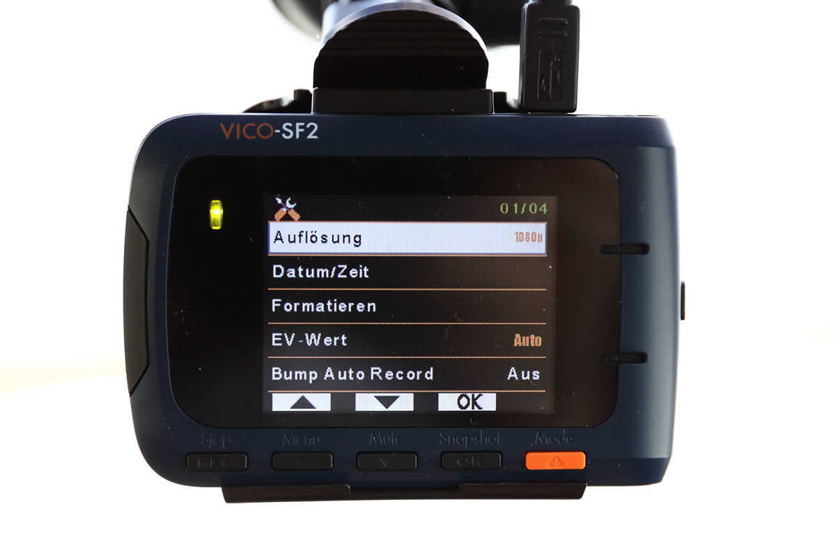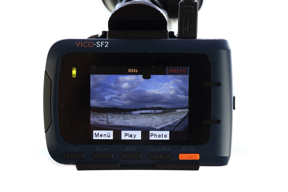 Die Vico SF2 ist im Gegensatz zur Vico WF1 eine klassische Dashcam mit großem Bildschirm und Bedientasten. Das Bedienkonzept, mit Ausnahme der unvollständigen deutschen Übersetzung, ist intuitiv. Die SF2 hat eine stattliche Größe und ist deshalb nicht ganz so leicht im Auto zu platzieren. Unglücklicherweise verfügt die SF2 als einzige Dashcam im Test über keinen Akku. Auch wenn eine Dashcam für gewöhnlich fest in einem Fahrzeug verbaut ist, sollte ein Akku nicht fehlen. Bei einem starken Unfall kann häufig die Bordspannung zusammenbrechen und die Aufzeichnung wichtiger Ereignisse (z.B. Fahrerflucht) nach einem Unfall wäre somit nicht möglich. Zusätzlich zum Akku haben wir im Test einen GPS-Empfänger vermisst. Gerade die Aufzeichnung der GPS-Position kann im Ernstfall hilfreich sein, um das Video leichter einem bestimmten Streckenabschnitt zuordnen zu können.