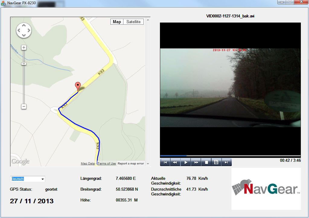 Weitere Funktionen, z.B. einen Export der GPS-Daten, gibt es nicht. Die Anzeige der G-Sensordaten ist nicht möglich, da die NavGear MDV-2880 als einzige Cam im Test keinen G-Sensor besitzt.