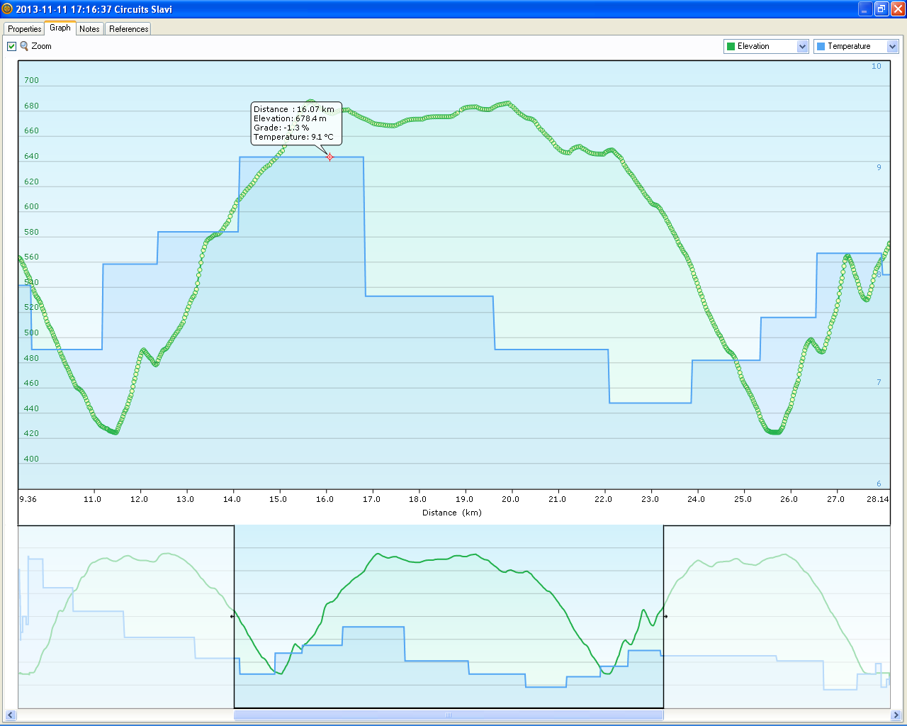 Fazit: Die Höhendifferenz der gesamten Strecke ist 435 m und hat nur kurze Gegensteigungen. Die Werte für den Aufstieg der fenix sind plausibel und liegen alle nahe zusammen. Die Standardabweichung der Streckenlängen (mit fenix) beträgt 0.6 %. Die Aufzeichnungsrate “Normal” erzeugt genügend Datenpunkte für eine präzise Auswertung.