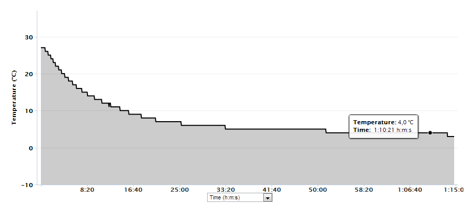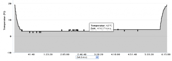 Der tempe wurde für 6 h über Nacht hinausgestellt. Der Ladezustand ist nach 6h von 100% auf 81 % gesunken. Die File Grösse beträgt 525 KB. Bereits nach 12 Minuten ist die Temperatur auf der Zieltemperatur equilibriert (von 19°C-Küchentemperatur auf 4 °C Aussentemper).
