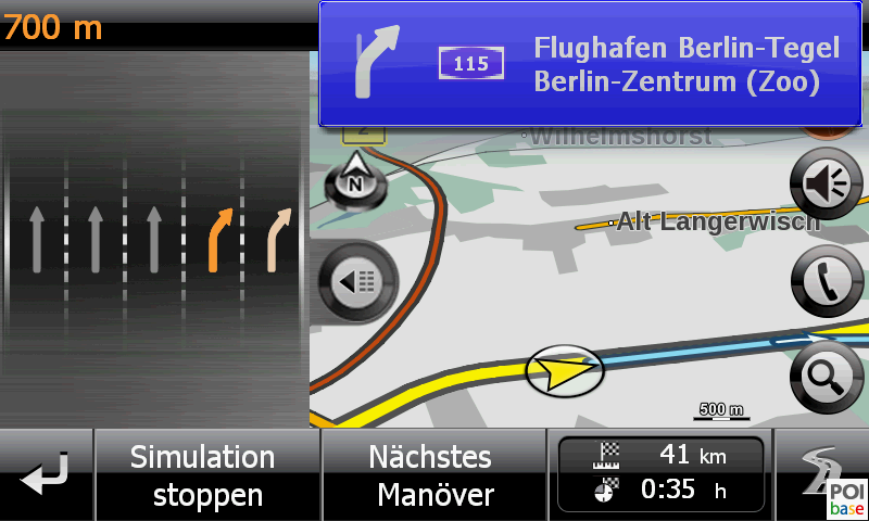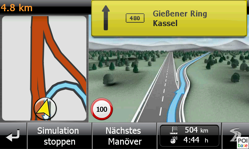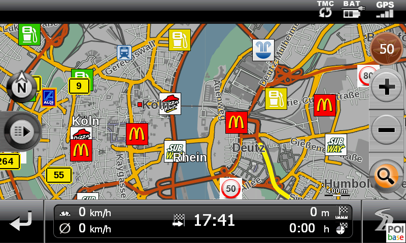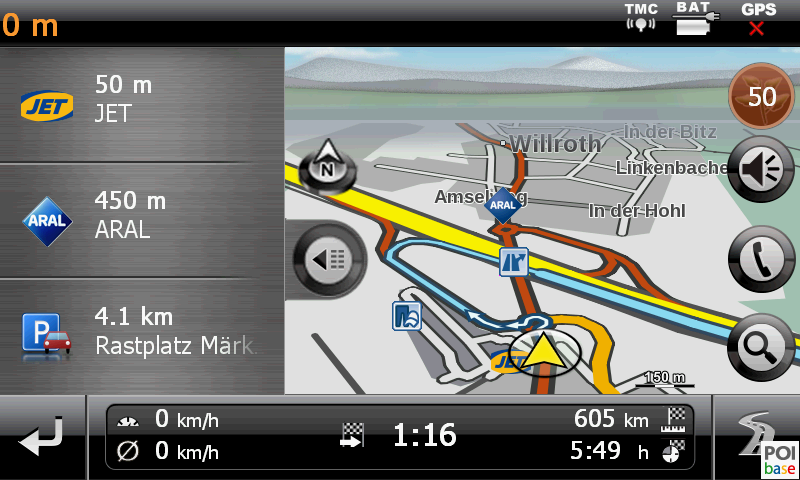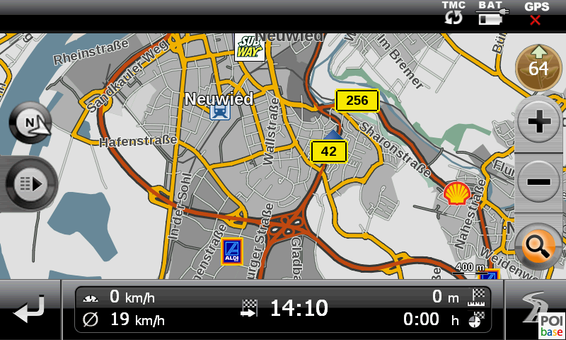 Auch die Infoleiste des MEDION GoPal E5470 hat sich nicht geändert. Am oberen Bildschirmrand informiert eine Leiste über den aktuellen Akkustand sowie den TMC- und GPS-Status. Eine weitere Leiste nimmt etwas mehr Platz unterhalb der Navigationsansicht ein und zeigt fahrtrelevante Informationen wie die voraussichtliche Ankunftszeit, die restliche Fahrtzeit, die verbleibenden Kilometer und die aktuelle sowie die durchschnittliche Geschwindigkeit. An der linken Seite ist darüberhinaus ein Kompass und ein aufklappbares POI-Menü zu finden. Es bietet schnellen Zugriff auf die nächste Tankstelle oder den nächsten Rastplatz. Auch auf verschiedene Einstellungen und das Telefonmenü kann über die Karte zugegriffen werden. Ein Großteil der Steuerelemente wird für eine bessere Übersicht transparent dargestellt und bei Betätigung komplett eingeblendet.