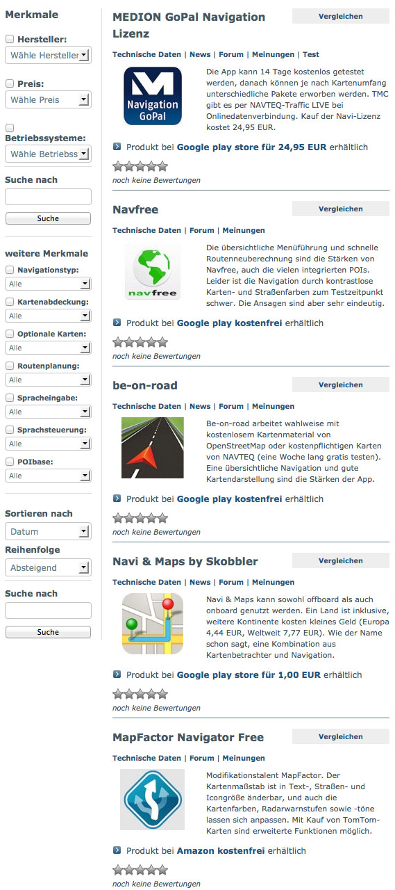 Mittels Filtern zu Hersteller, Preis, Karten etc. kann der Suchende dann das für sich passende Navi finden. Die Wichtigkeit misst der Nutzer jeder einzelnen Option selbst bei. Von bis zu drei Geräten oder Apps können so die einzelnen Merkmale gegenübergestellt werden.
