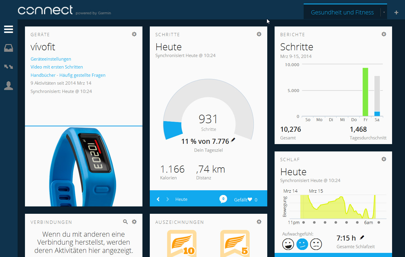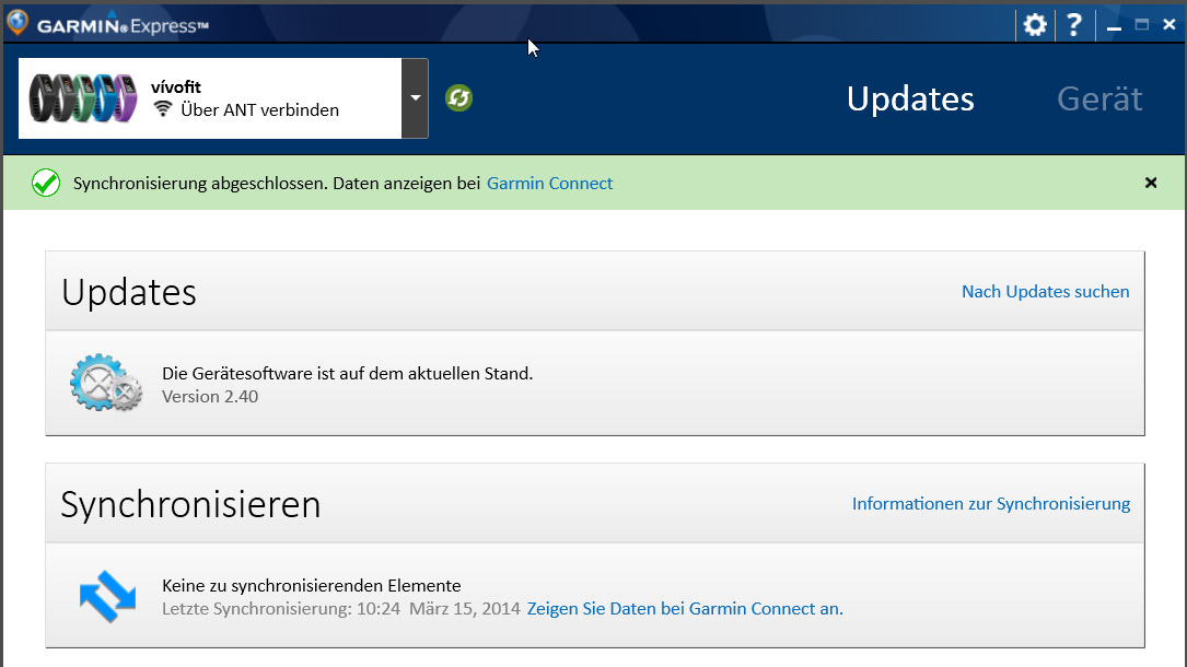 Auch wenn die Uhr bereits die Werte Uhrzeit, Datum, Tagesschritte, Tageskalorien, Tagesaktivitätspunkte, Tageskilometer und aktuelle Herzfrequenz direkt auf dem Display anzeigt, liegt die wahre Stärke in den Auswertungen, der an einen PC, Mac oder ein Smartphone übertragenen Daten. Die Übertragung erfolgt per ANT+ (Smart Bluetooth) USB-Stick an die Software Garmin Express. Die Übertragung wird durch einen längeren Tastendruck an der Vivofit gestartet und dauert nur wenige Sekunden. Garmin Express überträgt die Daten in die Onlineauswertung Garmin Connect.
