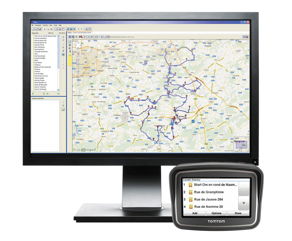- Intelligente Routenerweiterungsfunktion, um zu vermeiden, dass die am PC geplante Route von der tatsächlichen Route auf dem TomTom RIDER abweicht. (Der TomTom RIDER speichert Routen anhand von Wegpunkten. Durch das Ergänzen von bis zu 48 Wegpunkten vermindert Tyre Pro die Wahrscheinlichkeit, dass die Route auf dem PC von der auf dem RIDER gespeicherten Route abweicht.)