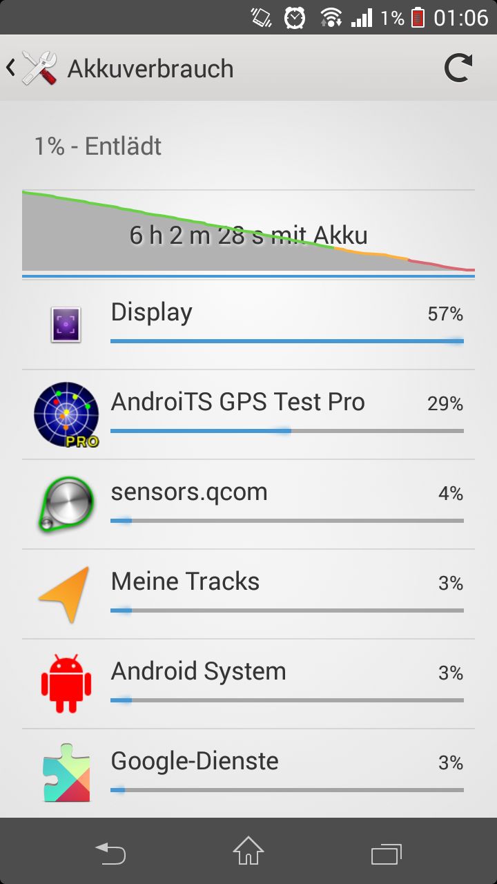 In den ersten „Spieltagen“ zeigte das Z1 Compact ein durchaus beachtliches Durchhaltevermögen, an denen es mit Installationen, Herumspielen, Ausprobieren, Syncen usw. fast durchgehend gequält wurde… Beide Geräte wurden auch unserem Standard-Akkulaufzeit-Test unterzogen, wobei die volle Displayhelligkeit (100%) eingestellt war und ein GPS-Tracking (5s Intervall) lief. Das Z1 war nach 04:35h leer, das Z1 Compact hielt sogar knapp über 06:00h durch (siehe Abbildung rechts)! Auch wenn in der Praxisnutzung die Werte aufgrund von Texteingaben, Displayscrollen u.ä. etwas darunterliegen dürften, das sind für Smartphones sehr gute Werte und sprechen für ein effektives Energiemanagement, welches Sony hier in seine Topmodelle implementiert hat.