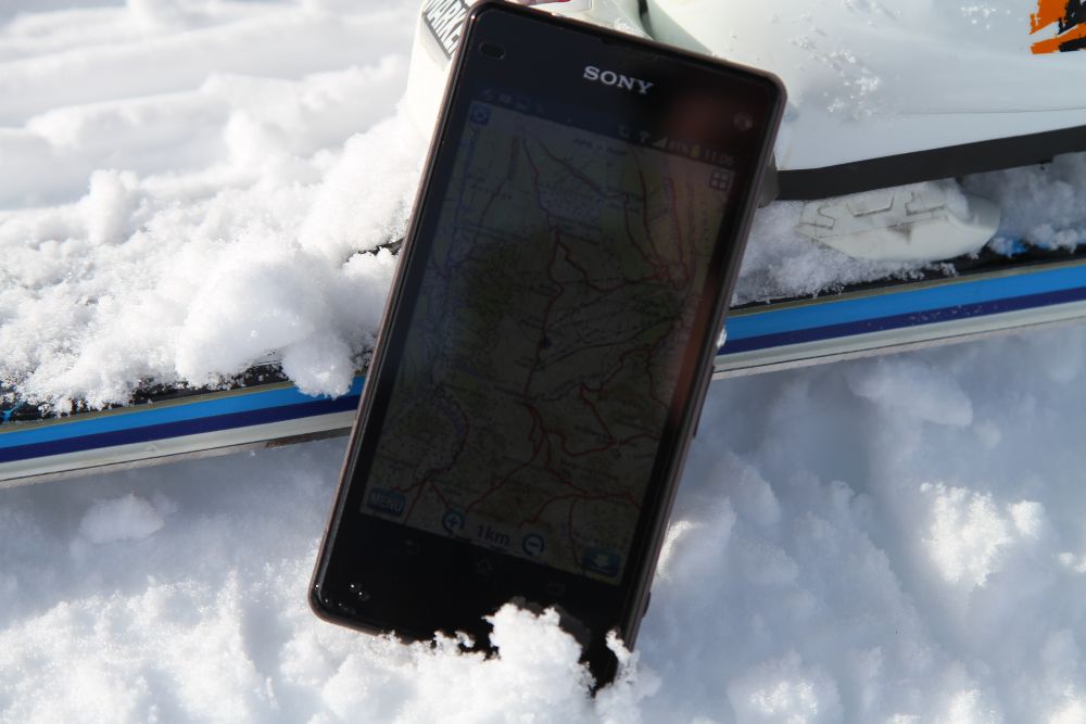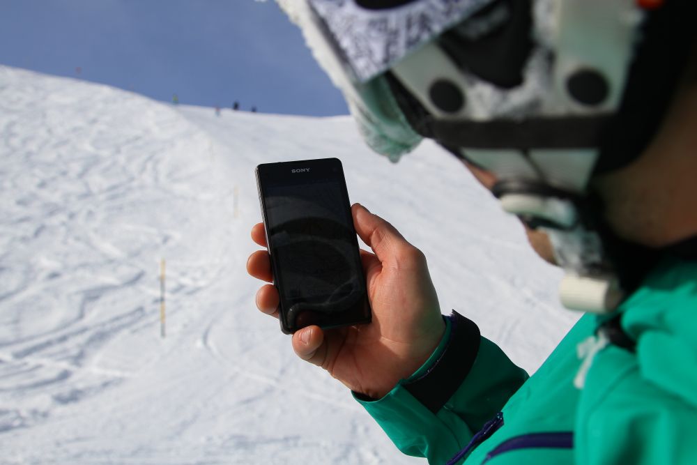 Hier noch zwei Beispiele vom Einsatz auf der Skipiste, die beide deutlich zeigen, dass bei direkter Sonneneinstrahlung nichts mehr zu erkennen ist. Wird das Smartphone aber im richtigen Winkel gehalten oder durch die andere Hand für etwas Schatten gesorgt, kann man sich auch unter solchen schwierigen Bedingungen behelfen. Vielen Dank an die freundliche Unterstützung der Axamer Lizum.