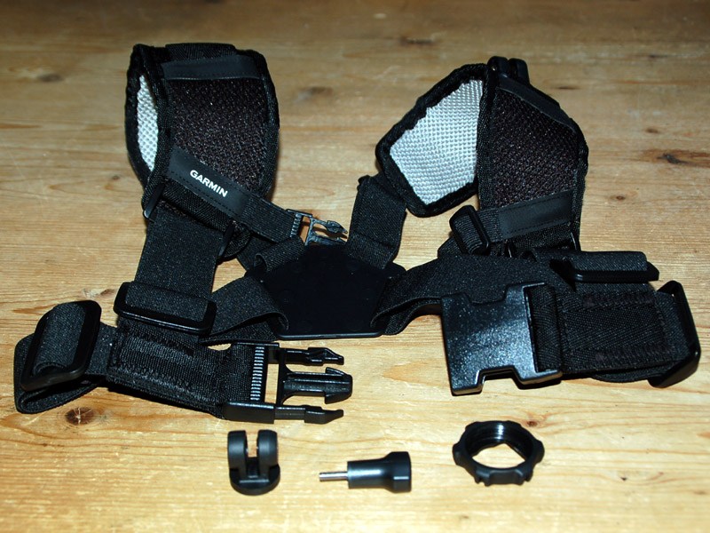 Wem die fixe Arretierung allein nicht genügt, und dies dürfte wohl die größere Zahl der Virb-Nutzer sein, kann aus Garmins reichhaltigem Zubehörangebot schöpfen. Das Testequipment wurde um einen Saugnapf (wie er z.B. im Kfz Verwendung findet) und eine Schultergurthalterung ergänzt. Letztere erlaubt es die Kamera auf der Schulter zu positionieren. Darüber hinaus stellt Garmin weitere Halterungen zur Verfügung, um die Virb an Körper, Helm oder Sportgerät bzw. Fahrzeug sicher zu befestigen. Allerdings eignet sich nicht jede Halterung für jedes Vorhaben gleich gut. So erwies sich der Schultergurt als wenig zweckdienlich für das Mountainbiking, während ein Skifahrer eben diese Befestigungsart sehr positiv bewertete. Dazu später noch mehr.