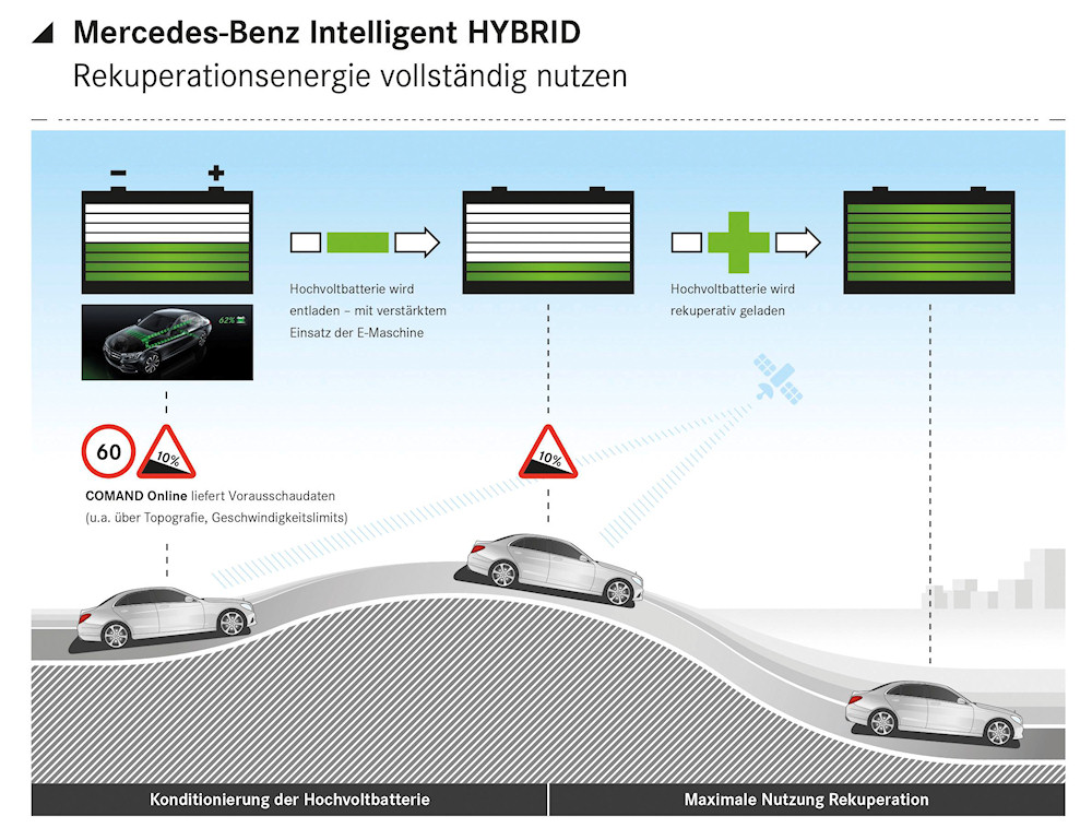 Laut Mercedes verschenken viele Hybridfahrzeuge bei Bergabfahrten unnötig Energie. Denn meist ist ihre Hochvolt-Batterie in diesem Moment zu voll geladen, um die bergab entstehende Rekuperationsenergie zusätzlich aufnehmen zu können. Mit der Intelligent-HYBRID-Methode, die Mercedes-Benz seit Sommer 2013 in der S- und jetzt auch in der C-Klasse einsetzt, soll die Hochvolt-Batterie nur so weit geladen sein, dass eine Rekuperation jederzeit möglich ist.