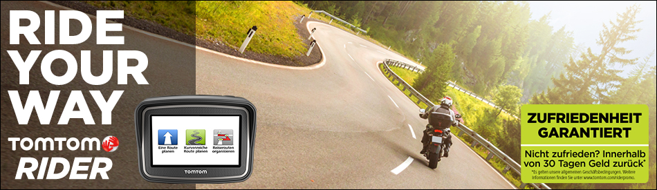 TomTom schickt seine Kunden weiter auf Entdeckungstour. Nach dem Start der TomTom App Testversion folgt nun die Buy Try Aktion für das TomTom RIDER. Käufer können das Gerät 30 Tage unverbindlich testen und erhalten bei Unzufriedenheit ihr Geld zurück. Die Erstattung erfolgt allerdings nur bei Vorlage des Original-Kaufbelegs über die Webseite https://www.tomtom-promotions.com/rider/DE