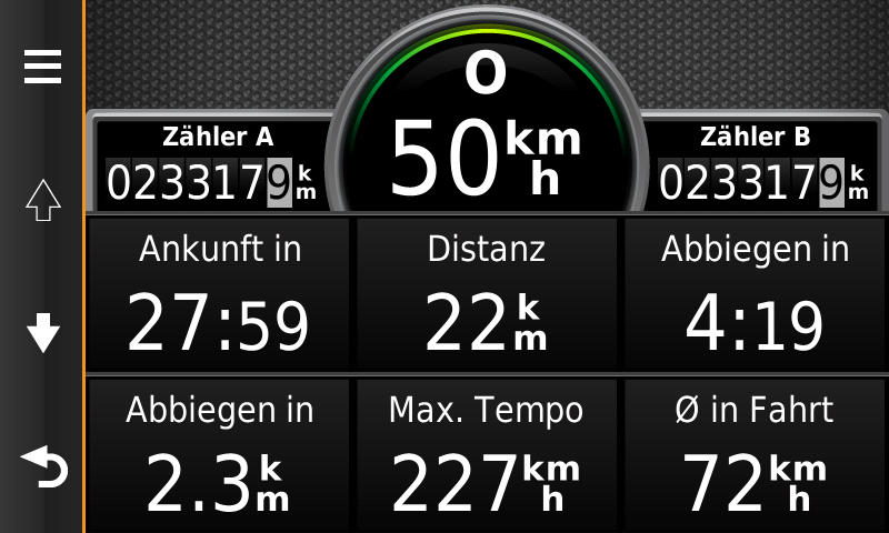 Durch Antippen der Geschwindigkeitsanzeige lässt sich das Garmin nüvi 3597 LMT in einen Bordcomputer, der alle relevanten Daten darstellt, verwandeln.