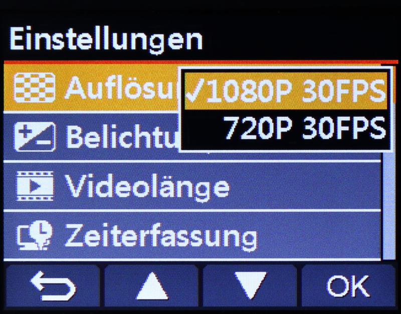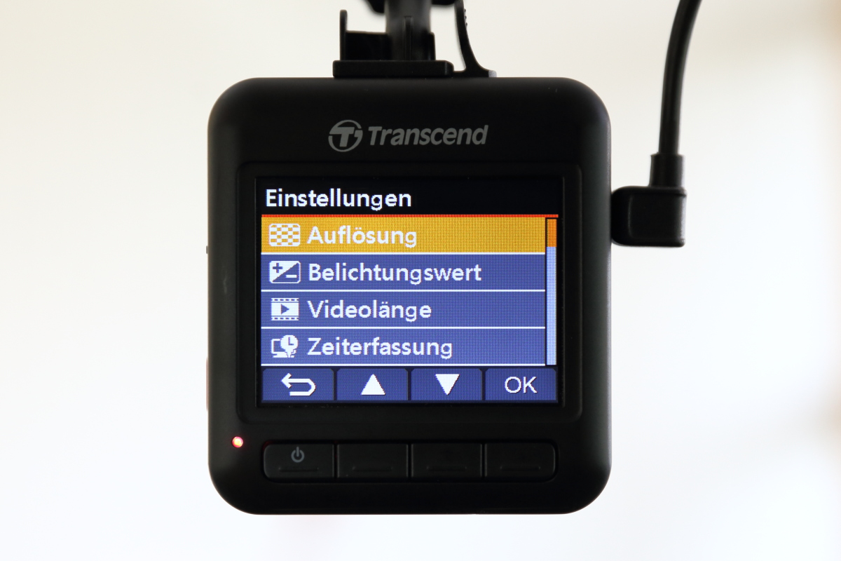 Die Bedienung der Dashcam erfolgt über vier Tasten, deren Funktionen jeweils über der Taste im Display dargestellt wird. Alternativ können Einstellungen auch über die DrivePro-App vorgenommen werden.