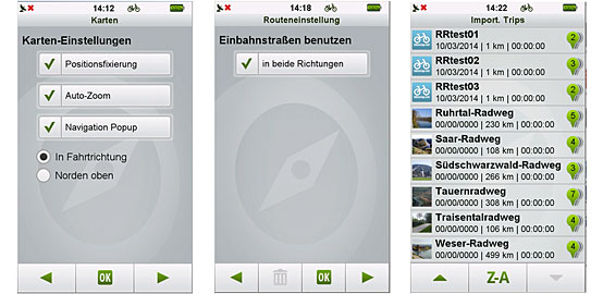 Die Navigationsanweisungen können abgeschaltet werden, ebenso die „magnetische“ Zentrierung auf Wege. Eine kleine Besonderheit: bei den Profilen kann man auswählen, ob man Einbahnstraßen in beide Richtungen oder nur in eine befahren möchte (Standardmäßig ist in beide Richtungen eingestellt). Und wenn der Akku mal an seine Kapazitätsgrenze kommt, erzeugt das Teasi optisch und akustisch eine Warnmeldung.