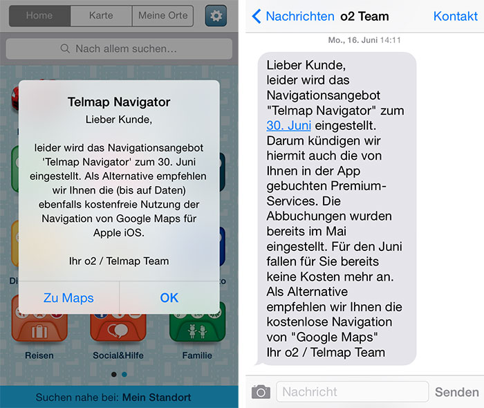 Die Intel-Tochter Telmap hatte 2010 die Zusammenarbeit mit o2 gestartet und stellt seitdem seine Smartphone-Navigationssoftware kostenlos für die Mobilfunkkunden des Anbieters zum Download bereit. In einer SMS an seine Kunden und mit einem Hinweis in der Telmap App machen beide Unternehmen nun darauf aufmerksam, dass man das Angebot zum 30. Juni einstellen wird.