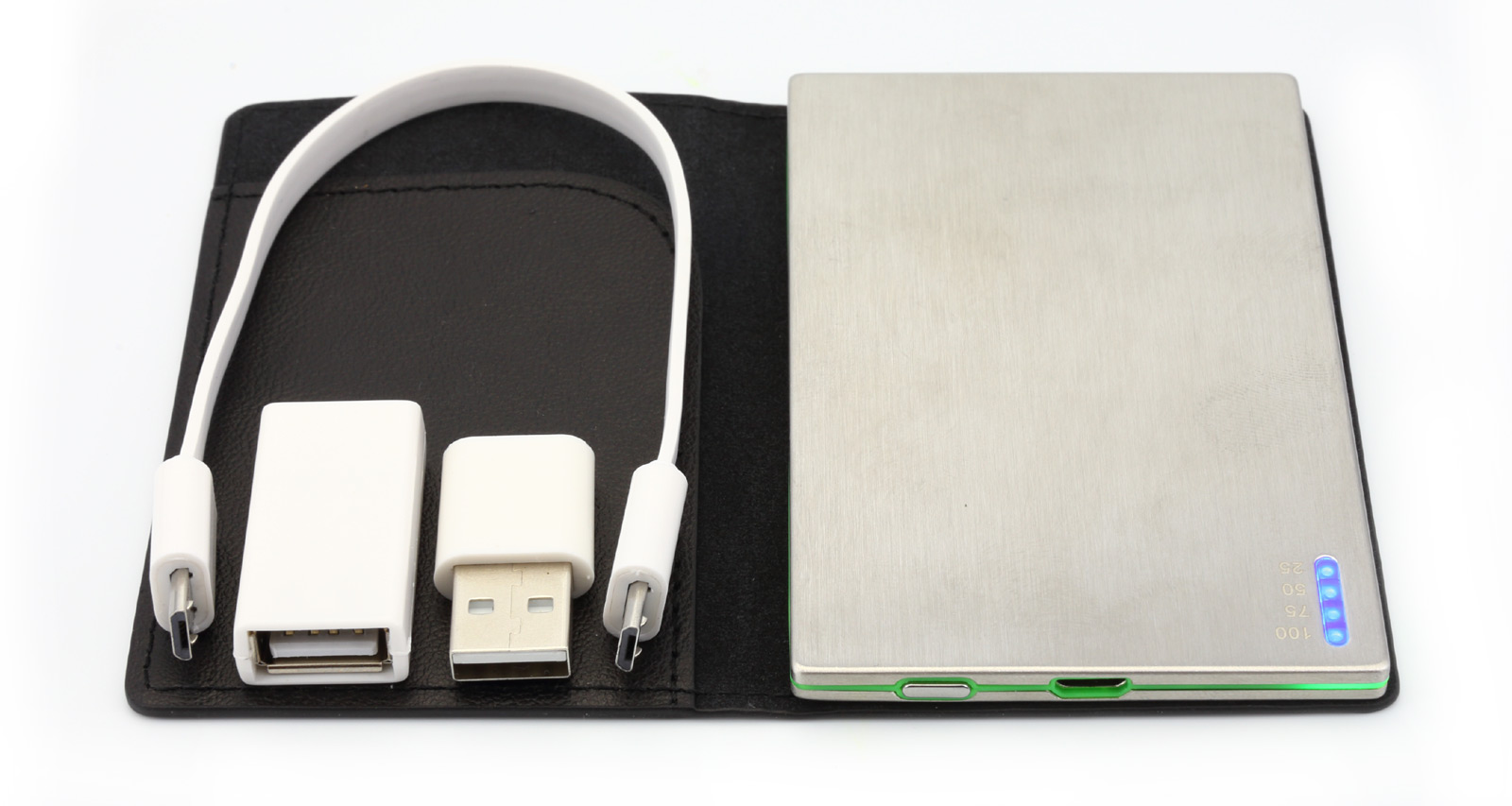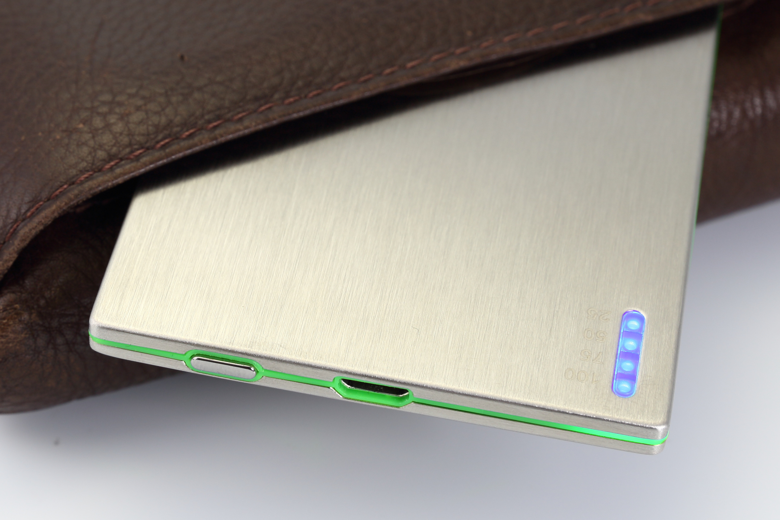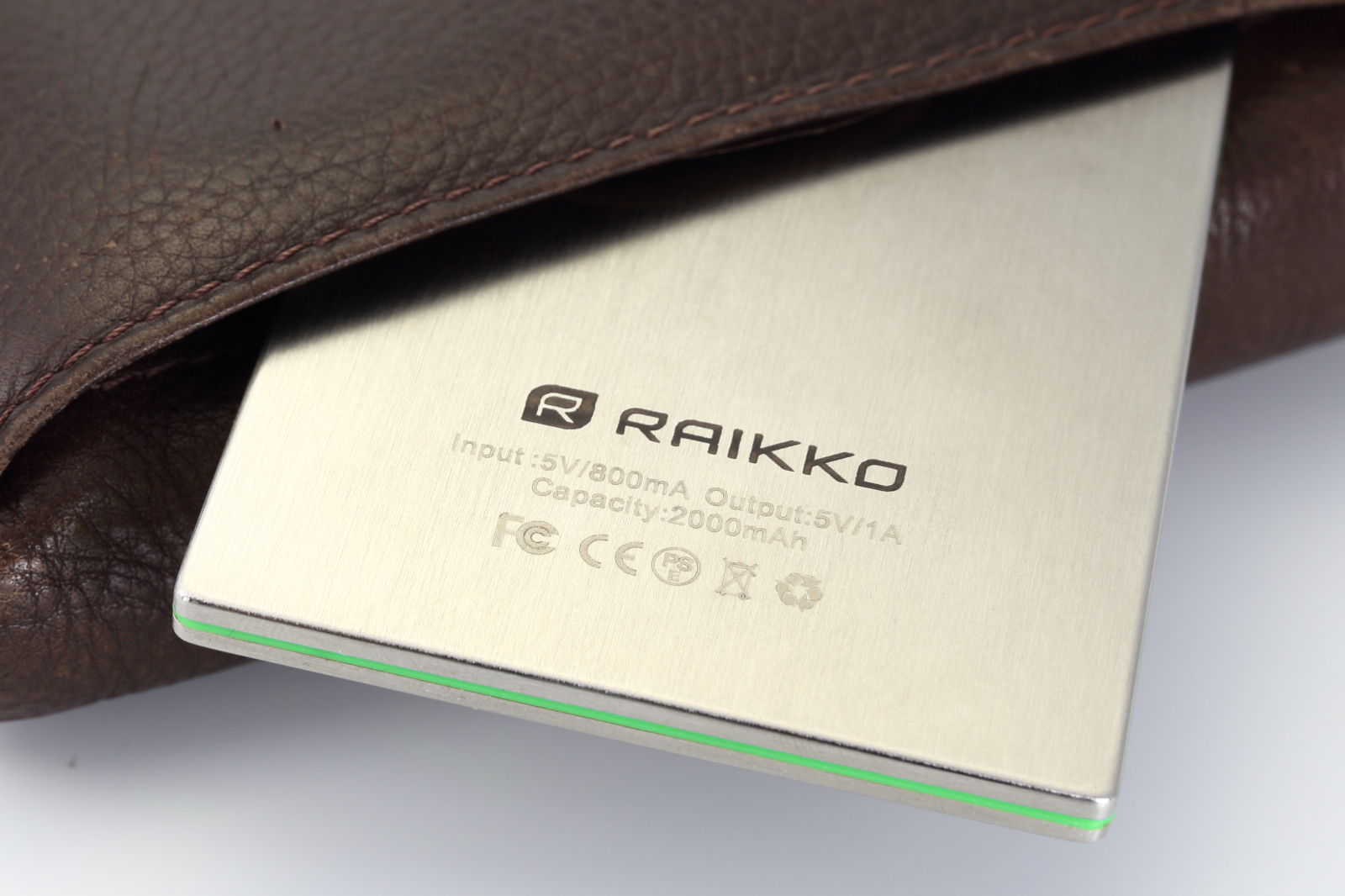 Der Raikko BusinessLine 2000 ist ein externe Lithium-Polymer Akku zum Laden von 5-Volt Verbrauchern. Das Gehäuse besteht klassisch und zeitlos aus eloxiertem Edelstahl und wirkt damit sehr hochwertig und edel. Die Verarbeitung ist tadellos, das Gerät ist kompakt und stabil. Das Design wird durch eine grüne umlaufende Zierleiste abgerundet, welche beim Ladevorgang grün leuchtet. Auch wenn Edelstahl ein wunderschönes Materialien ist, es neigt dazu, jeden Fingerabdruck sichtbar zu machen und relativ leicht zu verkratzen. Damit genau das nicht passiert, legt Raikko eine edle Ledertasche bei, in die der Akku bei Bedarf eingeklebt werden kann.