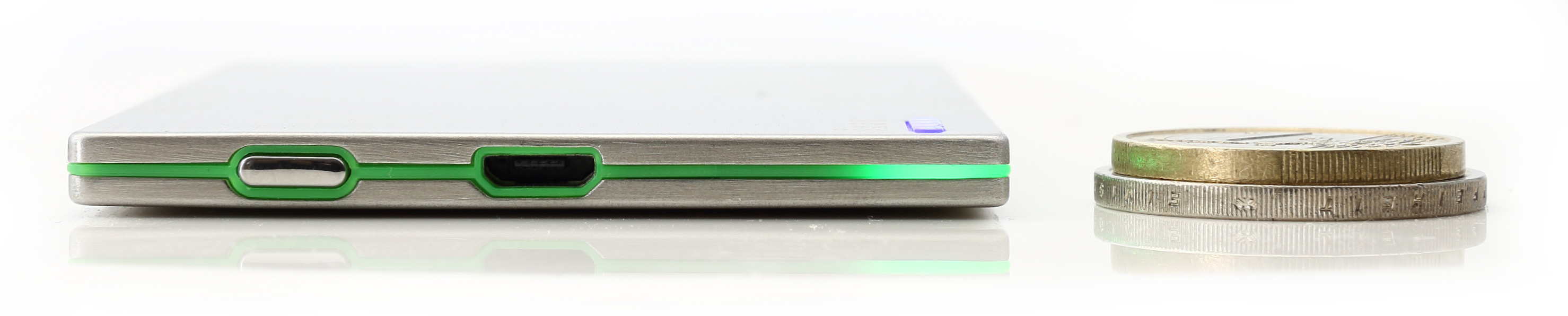 Mit seinen 78,8 Gramm erreicht der Akku eine Energiedichte von 4,9 Wattstunden pro 100 Gramm, was keine sehr hohe Energiedichte darstellt. Schönheit (Edelstahl) und Bauform fordern hier eindeutig Tribut. Knapp 80 Gramm sind jedoch kein riesiges Gewicht und werden im Portemonnaie z.B. auch durch 10 Münzen (5 x 2 EUR u. 5 x 1 EUR) erreicht.