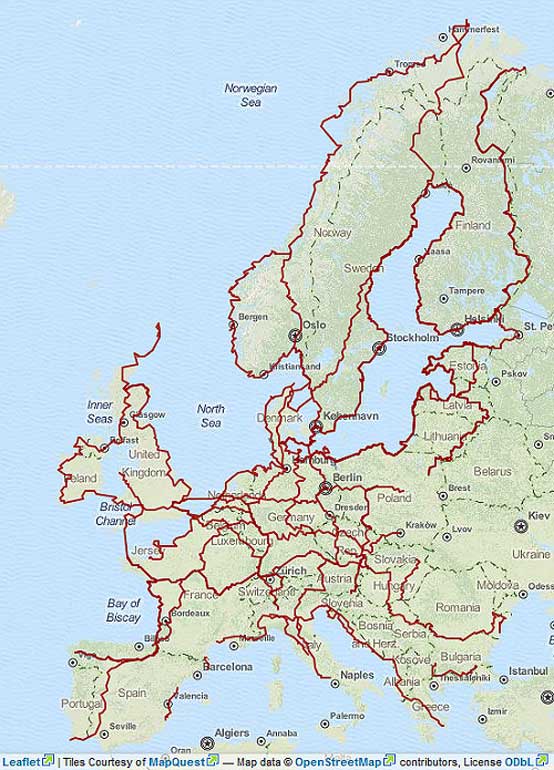 Die Tracks sind zum Teil als EuroVelo-Routen aus OpenCycleMap übernommen (siehe auch unseren früheren Beitrag), zum Teil sind sie aus Tracks nationaler oder lokaler Routen zusammengesetzt worden. Verbleibende Lücken im Routenverlauf sind durch aufgezeichnete Tracks von Radwanderern, die die Route befahren haben, oder durch selbst erstellte Tracks, die den Beschreibungen der Wegführung von EuroVelo nahe kommen, ausgefüllt worden. Die Gesamtlänge dieser Tracks umfasst derzeit 64.469 km (ohne km auf See).