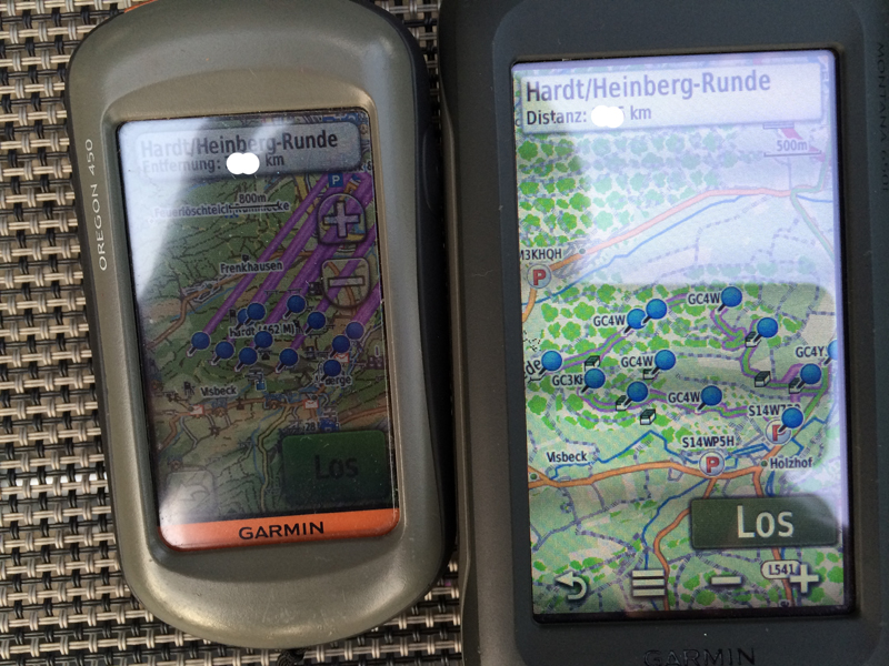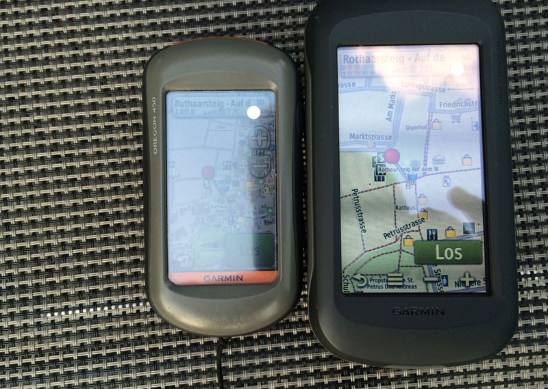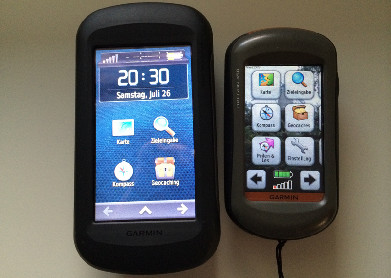 Als ich das Päckchen der Navithek in Händen hielt, war ich gleich zweimal überrascht. Zuerst über das Päckchen selbst, da ich keine Meldung darüber bekommen hatte, dass ich was bekomme. Dann beim Öffnen nochmal über den Inhalt, denn das Teil ist im Vergleich zum Oregon 450, das ich mein Eigen nenne, verdammt groß, um nicht zu sagen riesig! Richtig erschreckend ist das, wenn man beide Geräte nebeneinander legt. Ich musste es gleich mal einschalten und wurde direkt vom Display und der Bedienung überrascht, das ist nämlich auch kein Vergleich zum Oregon 450.