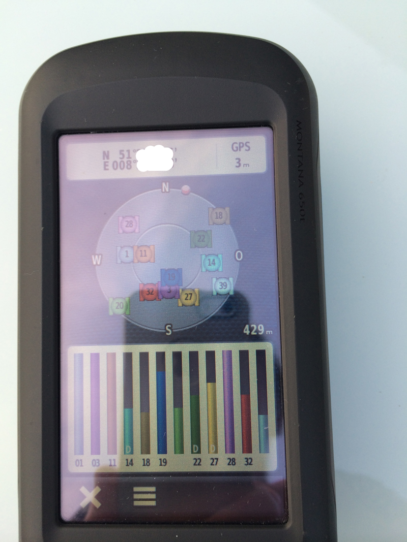 Ich habe zuerst eine aktuelle Karte und meine Cacheliste geladen und alsbald bin ich dann auf Schatzsuche gegangen. Allerdings stelle sich mir als erstes die Frage, wo verstaue ich das Teil jetzt??? Hosentasche? Dafür ist es zu groß. Da es sehr warm war, war an eine Jacke oder Weste nicht zu denken. Ich hab´mir dann mein Bandee umgeschnürt und dort passte es ganz gut in die Zusatztasche. Von der Handhabung beim Cachen muss ich sagen, war der große Bildschirm schon ganz hilfreich. Man sieht richtig was von der Karte und die Beschreibung lässt sich super lesen. Die GPS Genauigkeit war bisher super (3m sonst eher 5m). Toll fand´ ich die Funktion, bei der ich mir die Satellitenstände anschauen konnte. Ein paar Tage später bin ich am Wochenende mit meinem Mann und dem Hund auf eine kleine Wandertour losgezogen. Zuvor habe ich mir die einzelnen Caches auf BaseCamp gezogen und mir darin meine Route erstellt, die ich ablaufen wollte. Wieder hatte ich mein Bandee dabei, damit ich das Gerät verstauen konnte. Das Oregon hatten wir wie immer an einer Kletthalterung am Rucksack festgemacht. Mit dem Montana kann ich mir das ehrlich gesagt nicht vorstellen. Auch hänge ich mir das Oregon, wenn ich allein unterwegs bin, gern um den Hals, auch das ist mit dem Montana eher unmöglich. Kritikpunkte Das Montana ist aufgrund der Größe sicher nicht für alle Sportarten geeignet, so meiner Meinung nach auch eher nicht zum Wandern oder zum Geocaching. Auf dem Bike und auch im Auto bestimmt super, könnte ich mir vorstellen. Gewicht sparen und auch Größe minimieren: Warum Batterien und nicht einfach ein zweiter Akku??? Diese Frage habe ich mir gestellt. Mir persönlich wäre ein Ersatzakku, wesentlich lieber als weitere 3 Batterien mitzuschleppen. Und man könnte den Platz im Gerät sparen! Von der Bedienung, dem Display und der technischen Funktionalität bin ich begeistert und würde das Montana auch weiterempfehlen, allerdings ist es für meine Zwecke zu groß!