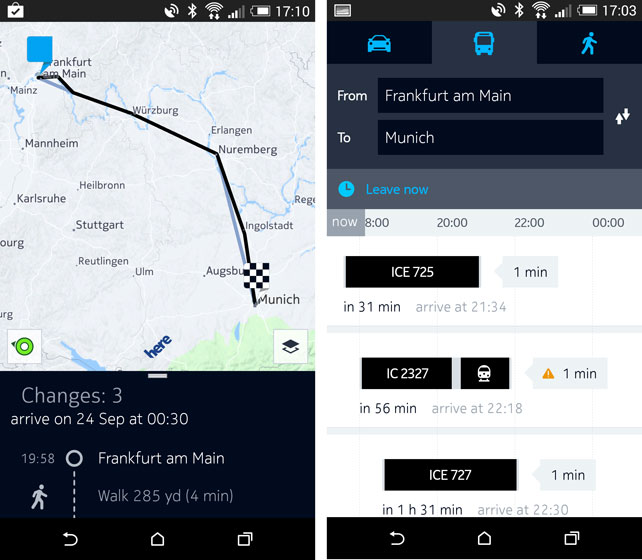 Mit den HERE Apps können Nutzer zukünftig bei der Planung einer Route auch des gesamte Streckennetz der Deutschen Bahn mit einbeziehen. Die Routenanfragen laufen dabei direkt über das System der Deutschen Bahn, was eine hohe Aktualität der verfügbaren Informationen gewährleistet. Auf langen Reisen entfällt somit die Notwendigkeit, zwischen Angeboten verschiedener Anbieter hin und her wechseln zu müssen.