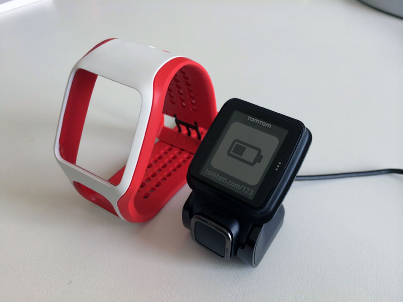 Wie bereits das Vorgängermodell, lässt sich die Display-Einheit der TomTom Runner Cardio mit wenigen Handgriffen vom Armband trennen. Die Uhr kann mit oder ohne Armband in die Ladestation eingesetzt werden.