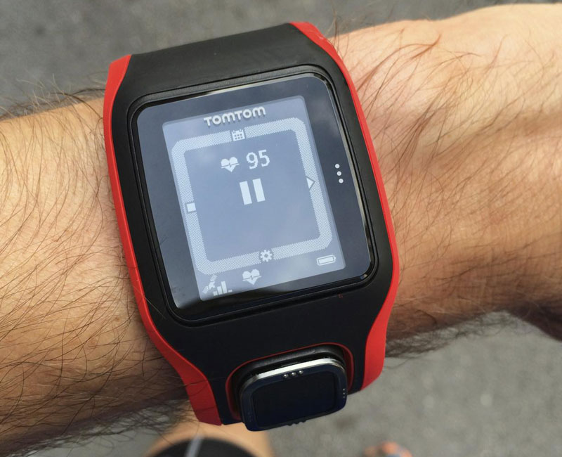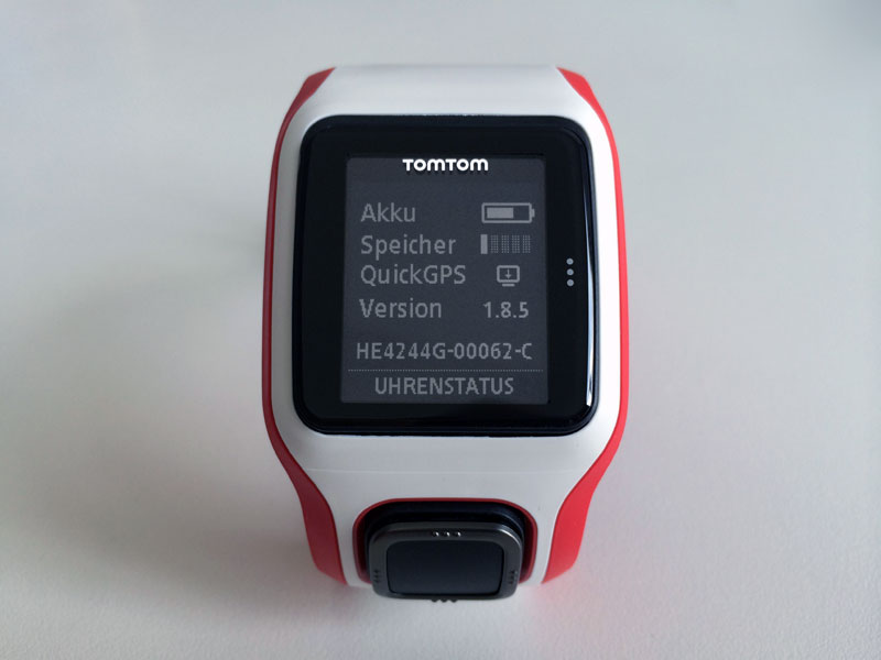 Beim Starten einer GPS-Uhr dauert es zumal relativ lange bis genügend Satellitensignale empfangen werden. Dies hat zur Folge, dass mit dem Lauftraining erst nach 1-2 Minuten gestartet werden kann oder die ersten 200 bis 500 Meter nicht aufgezeichnet werden. Meistens startet die Zeitmessung also vor der Streckenmessung. Die führt schließlich zu einer falschen Durchschnittsgeschwindigkeit. Für eine genaue Datenaufzeichnung sollte man also unbedingt bis zum GPS-Empfang warten. Zur bedeutend schnelleren Erfassung der Satellitensignale lädt die TomTom Runner Cardio bei jeder Synchronisation (mit PC oder der mobilen App) ein entsprechendes Datenfile mit den vorausberechneten Satellitenlaufbahnen herunter. Leider können die Satellitenbahnen nur für drei Tage im Voraus berechnet werden. Im Statusbildschirm der Uhr kann abgelesen werden, ob die QuickGPS-Daten noch aktuell sind.