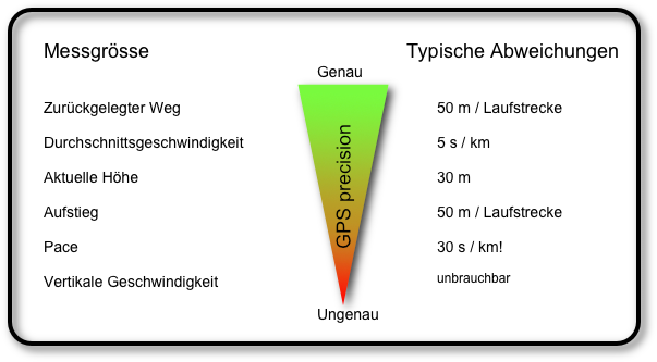 Die Genauigkeit ist bei Sportuhren im wesentlichen systembedingt und stößt auch mit den besten GPS-Empfängern an physikalische Grenzen. So ist zum Beispiel für die Geschwindigkeit ein kalibrierter Schuhsensor genauer als ein GPS-Empfänger. Und für eine exakte Höhenmessung ist ein barometrisches Höhenmesser unumgänglich.