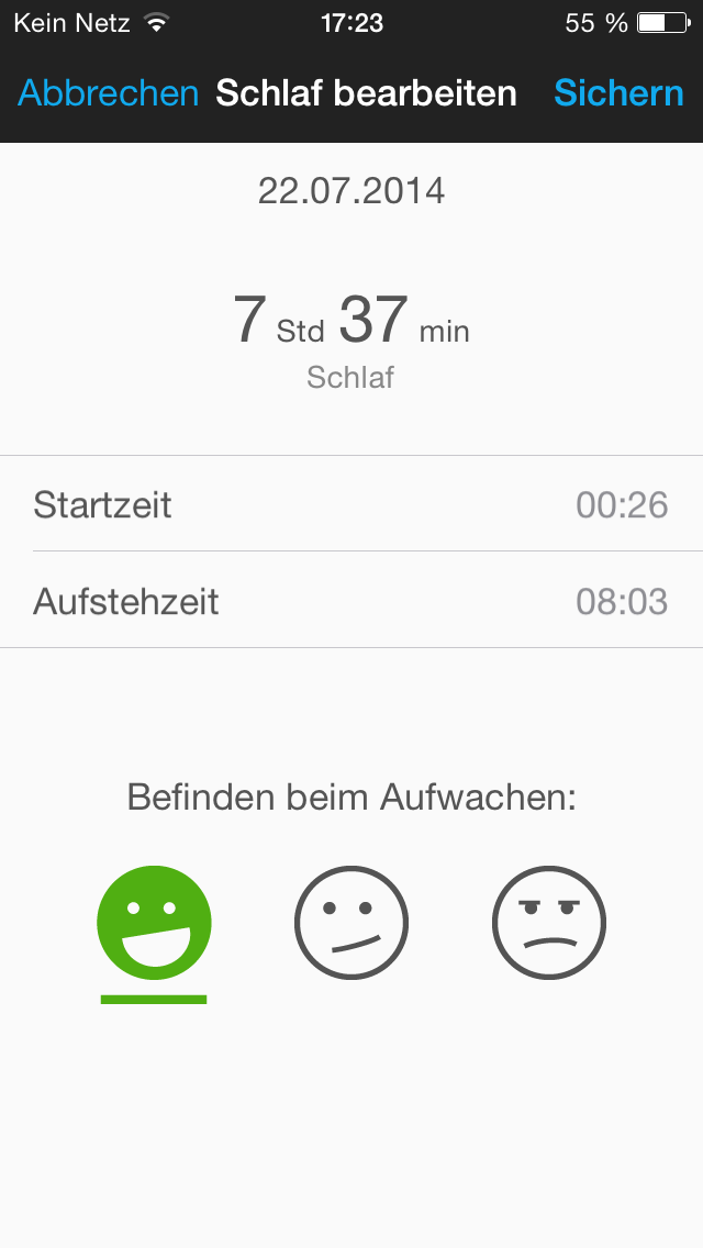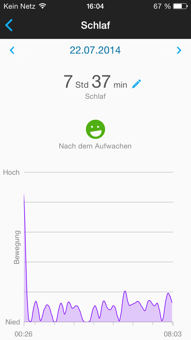 Beim Fitbit Flex wird der Schlafmodus durch mehrmaliges schnelles Tippen auf das Armband gestartet und genauso wieder beendet. Für die Auswertung der Daten steht sowohl eine Online-Plattform als auch eine App für Smartphones zur Verfügung. Miteinander verglichen, zeigen die beiden leider nicht die gleichen Werte an. Während beispielsweise beide Tools in einem Diagramm über die verschiedenen Schlafphasen informieren, zeigt nur die Online-Plattform an, wie lange die Einschlafzeit gedauert hat. Diesen interessanten Wert verschluckt die Smartphone-App komplett und stellt nur die gesamte Schlafdauer dar. Ebenfalls unverständlich ist, warum einzig über die Smartphone-App eine Aufschlüsselung der Daten in der Wochen-, Monats- oder Jahresansicht möglich ist. Weiterhin ist auch die Korrektur des Schlafzeitraums allein über die App ausführbar.