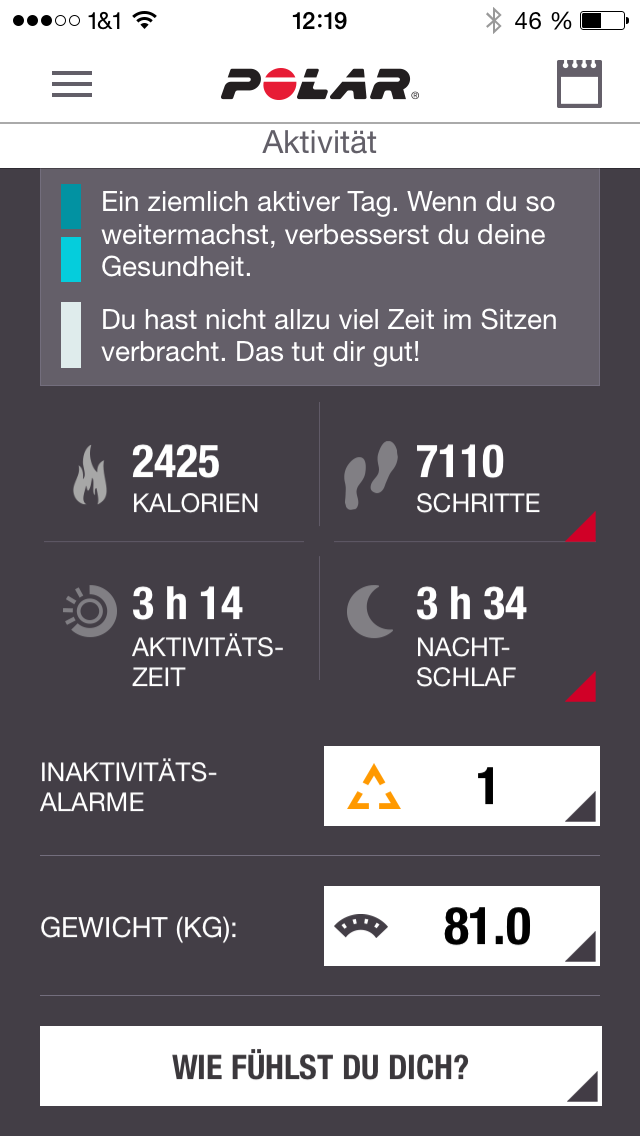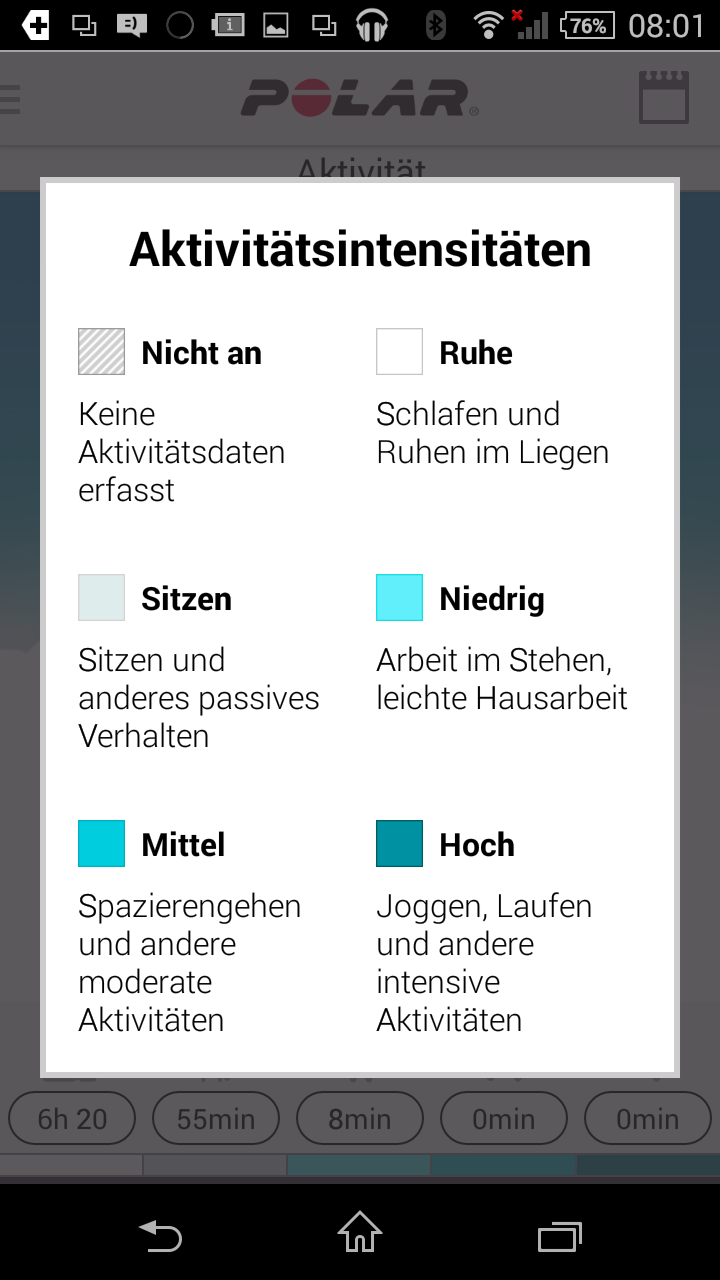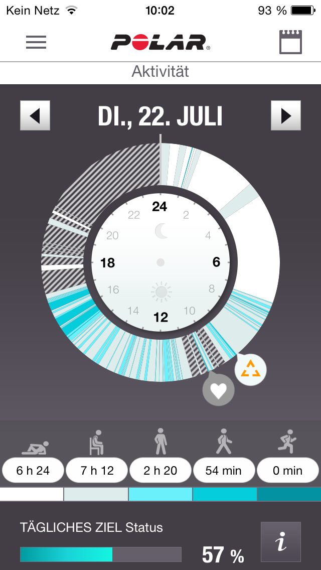 Die beste und ausführlichste Auswertung nimmt die Polar-Loop-App Polar Flow vor. In einem Diagramm werden dort Tageszeit und Dauer der unterschiedlichen Aktivitäten Liegen, Sitzen, Stehen, Gehen und Laufen ersichtlich. Die zusammenaddierten Aktivitätszeiten können nicht nur für einzelne Tage, sondern auch für Wochen und Monate aufgeführt werden. Ergänzend informiert das Diagramm über inaktive Stunden.