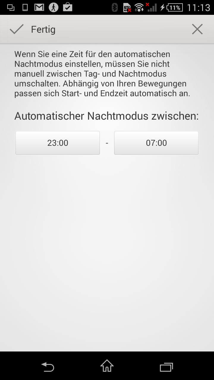 Ebenso kann ein automatischer Schlafmodus, der in einem bestimmten Zeitraum selbstständig zwischen dem Tag- und Nachtmodus wechselt, eingestellt werden. Wird als Startuhrzeit z.B. 23:00 Uhr festgelegt, beginnt der Nachtmodus automatisch, sobald nach dieser Uhrzeit keine Bewegungen mehr festgestellt werden. Morgens zur eingestellten Aufwachzeit wartet das Armband, bis Bewegungen festgestellt werden und wechselt erst dann automatisch in den Tagesmodus. Der automatische Wechsel muss über die Smart-Connect-App auf dem Android-Gerät aktiviert werden.