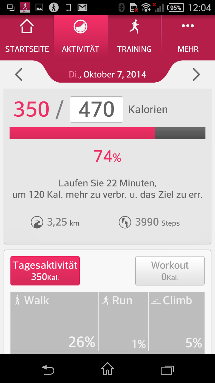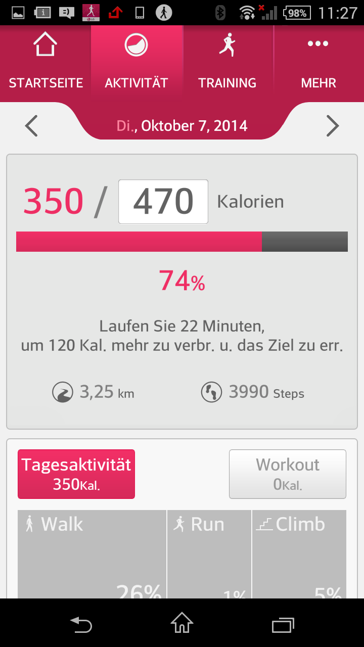 In Prozent wertet auch das LG Lifeband Touch die Aktivitäten aus und unterteilt dabei in Walk, Run, Climb etc. (weiteres).