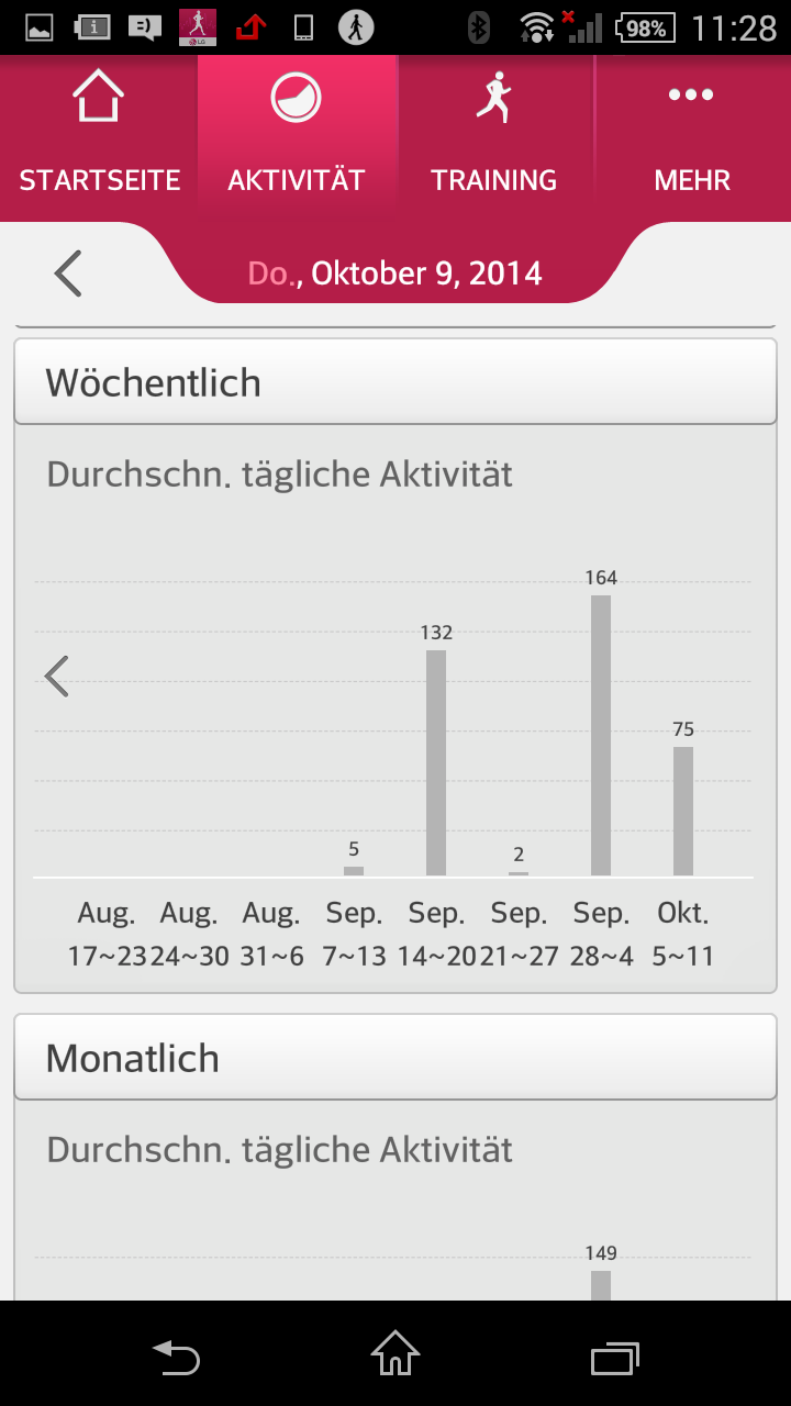 Die App Sony Lifelog schlüsselt Tagesaktivitäten getrennt nach Gehen und Laufen in Stunden und Minuten auf. Außerdem kann der Durchschnitt pro Tag und die längste sowie die kürzeste Dauer angezeigt werden.