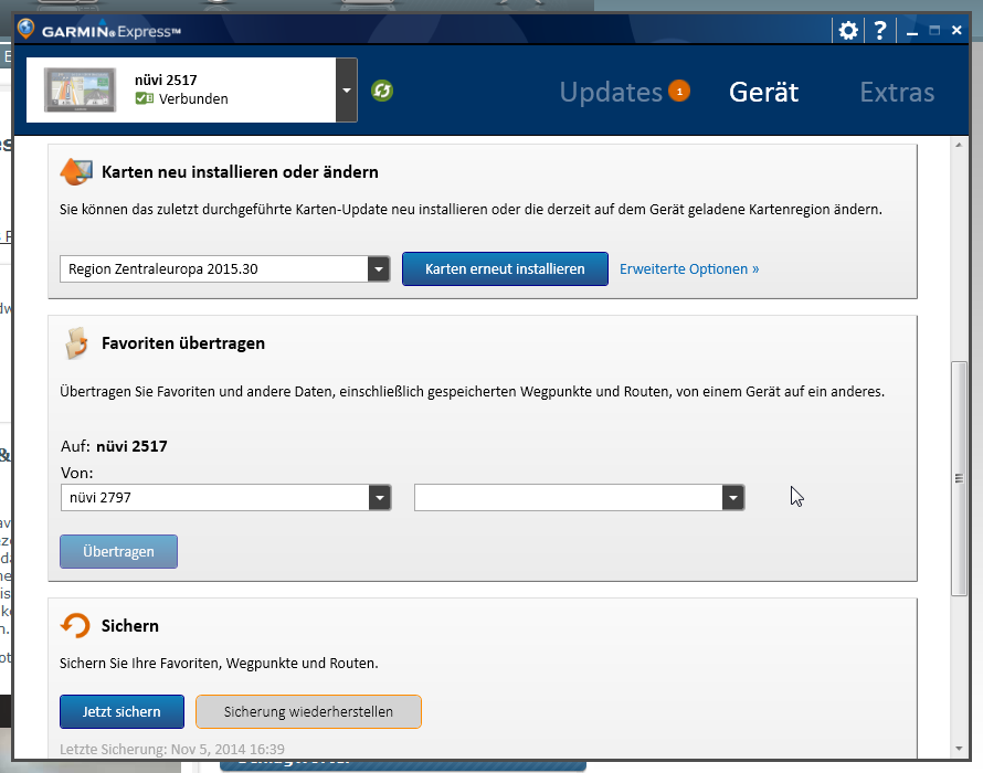 Zum Aufspielen neuer Karten, Firmware-Updates und weiterer Extras steht die kostenlose Garmin-Express-Software zur Verfügung. Zum Download und der Installation von Kartenupdates sollte, je nach Internetverbindung, einiges an Zeit eingerechnet werden. Zusätzliches und kostenpflichtiges Kartenmaterial für Fahrten außerhalb der abgedeckten Regionen bietet Garmin auf seiner Webseite an.