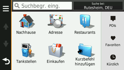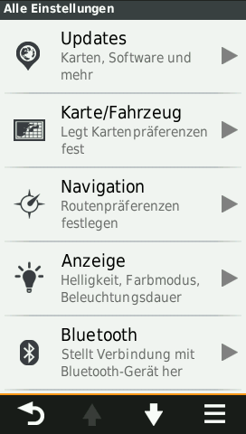 Nach dem Start zeigt das Garmin das Hauptmenü mit der Möglichkeit, ein Ziel zu suchen, die Karte anzuzeigen oder in das Einstellungsmenü zu wechseln. Die Rückkehr ins Hauptmenü ist jederzeit über einen Pfeil in der linken unteren Ecke möglich. Wird dieser kurz gedrückt, gelangt man zur letzten Seite, drückt man diesen länger, gelangt man direkt ins Hauptmenü.
